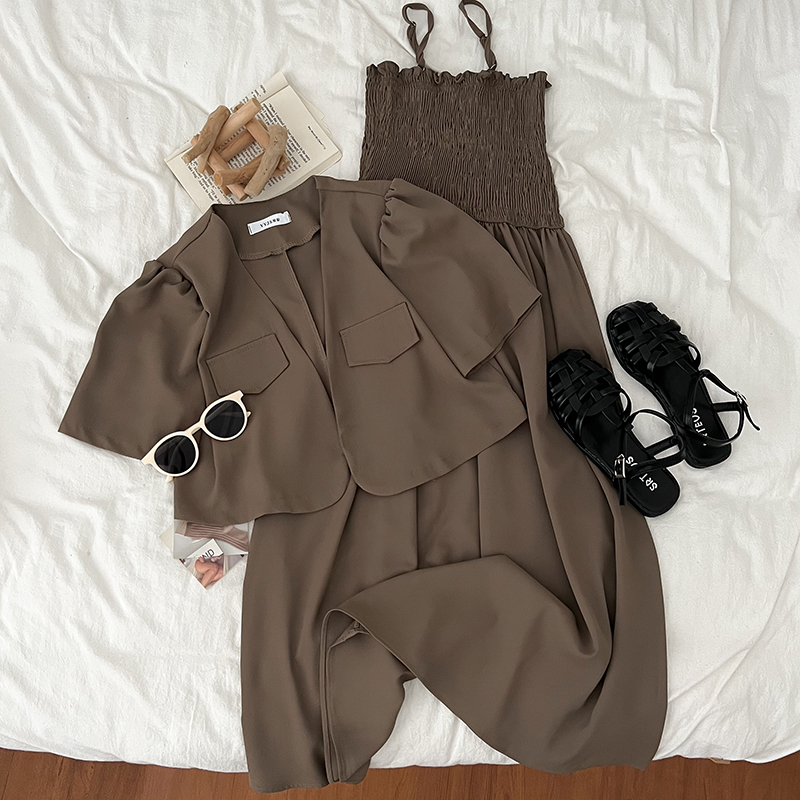 褶皱高腰显瘦中长款吊带连衣裙+西装短款外套开衫两件套女夏季