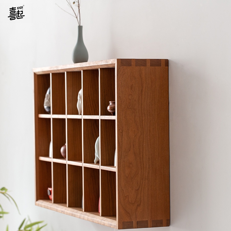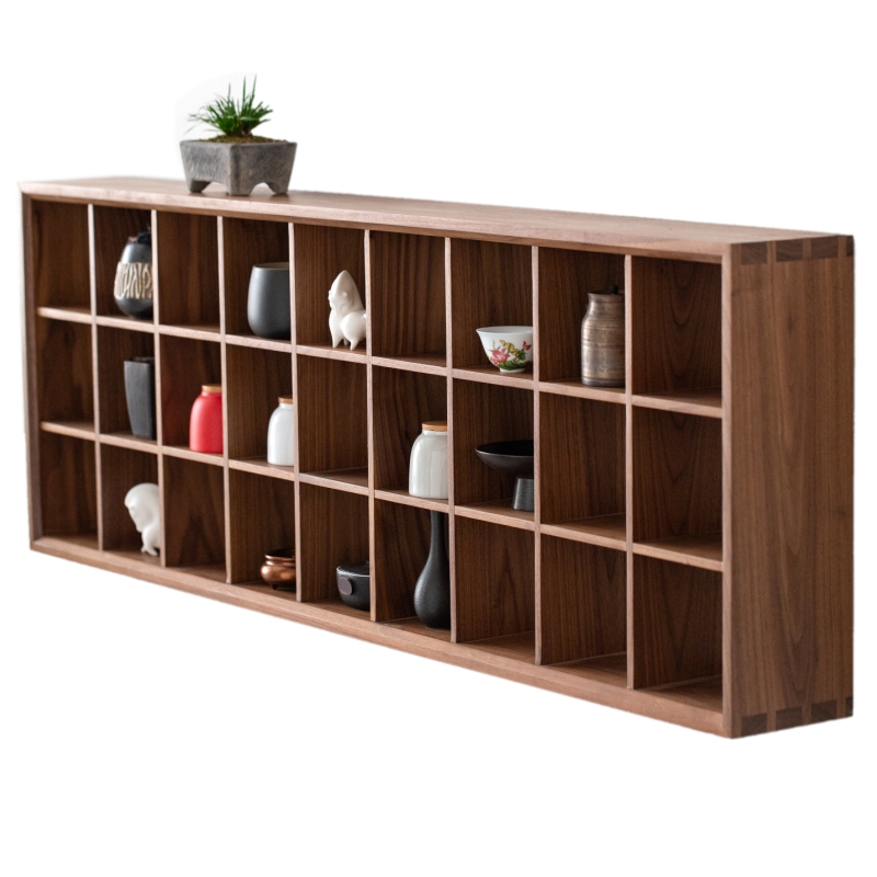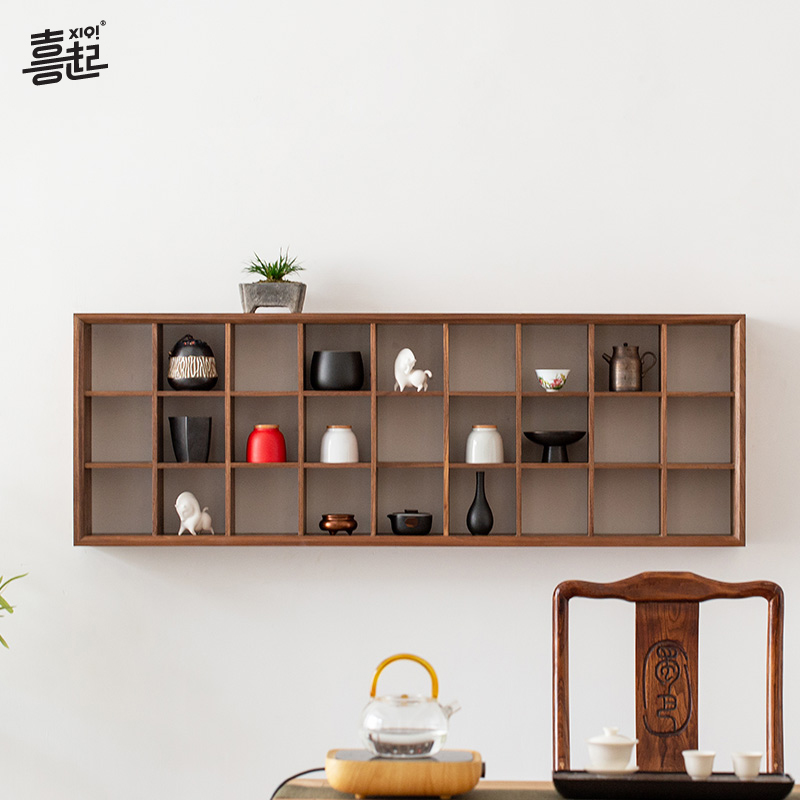 黑胡桃实木壁挂多宝阁 墙面格子置物架 茶室茶具摆件水杯收纳架子
