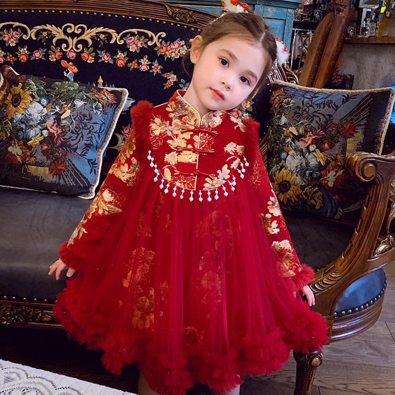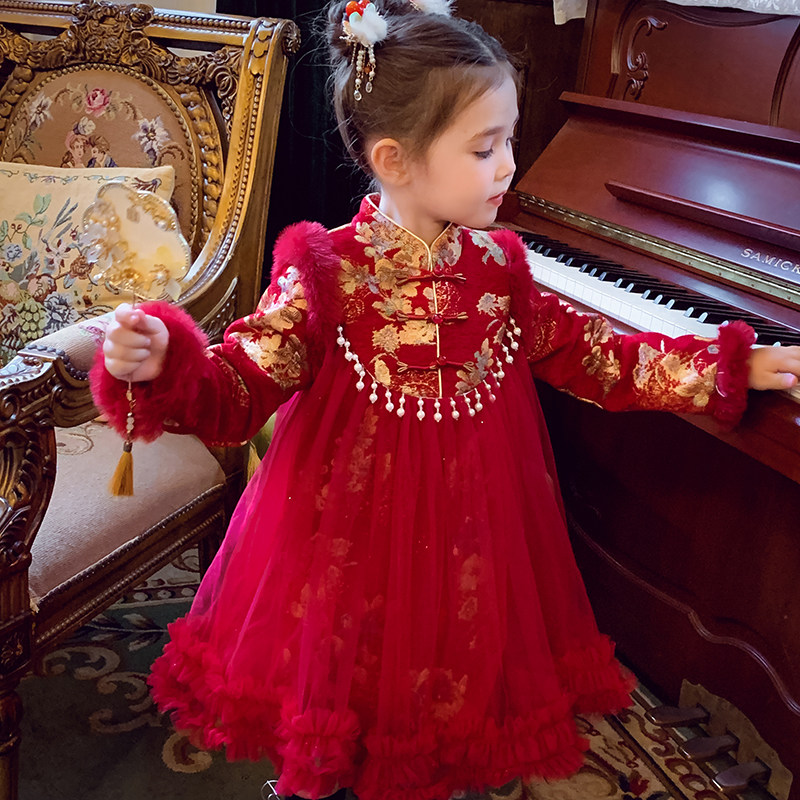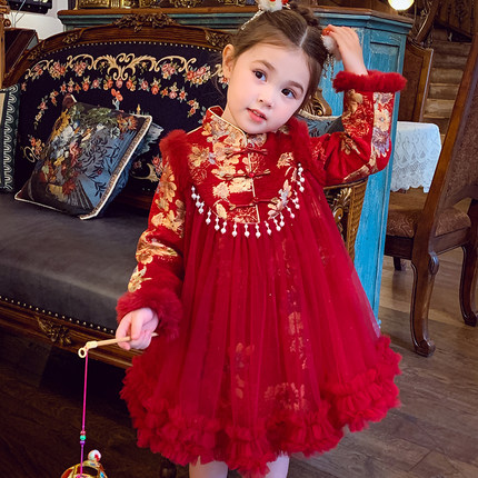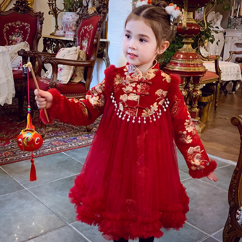 女童国风旗袍连衣裙女孩新年装冬装2025新款超洋气儿童加绒公主裙