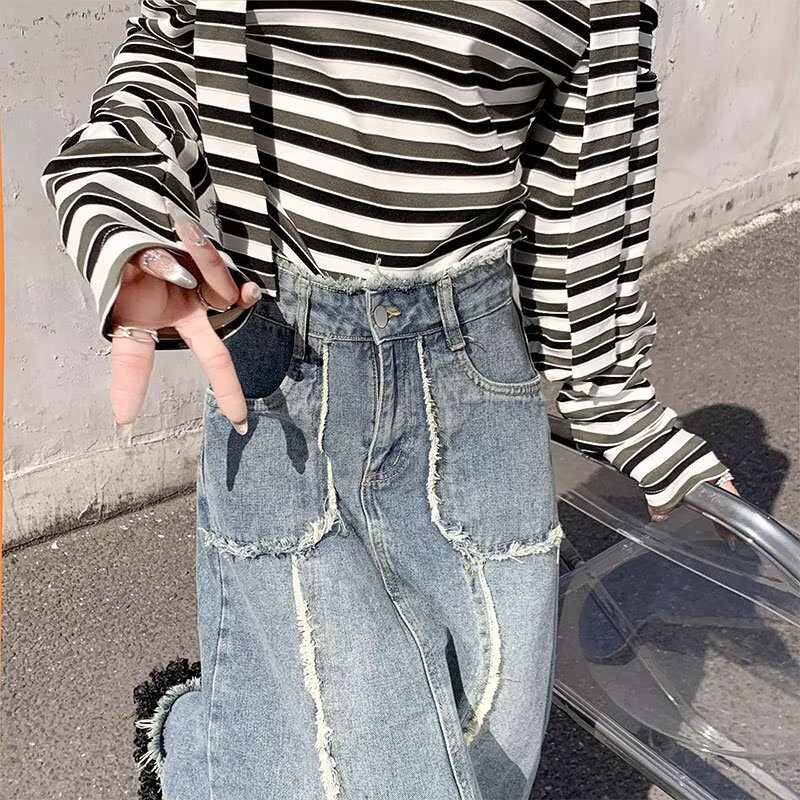 2025年秋季新品梨形身材小众拼接牛仔半身裙女遮胯a字中长款伞裙