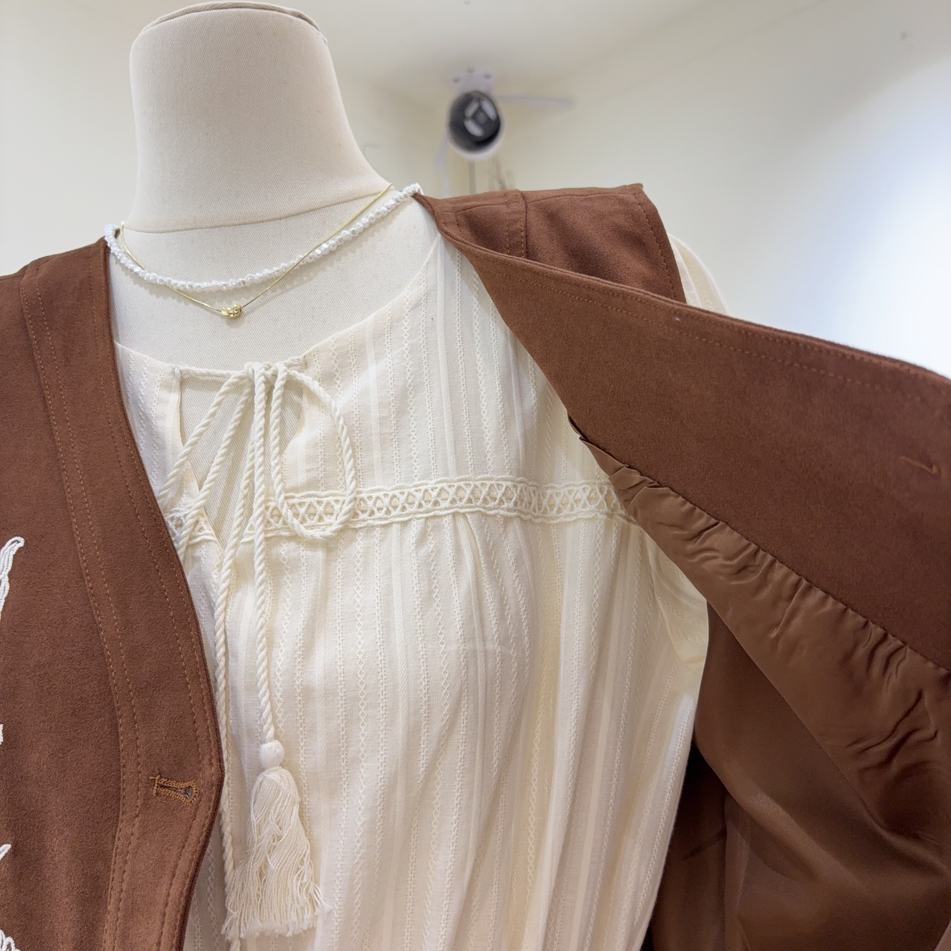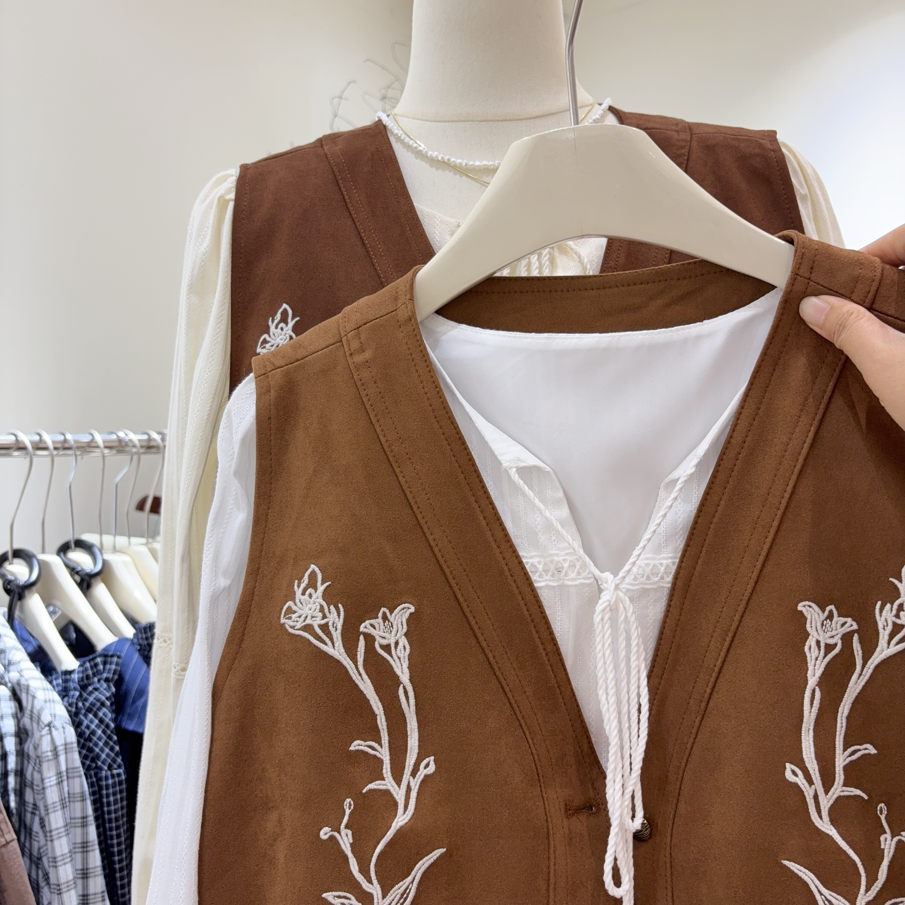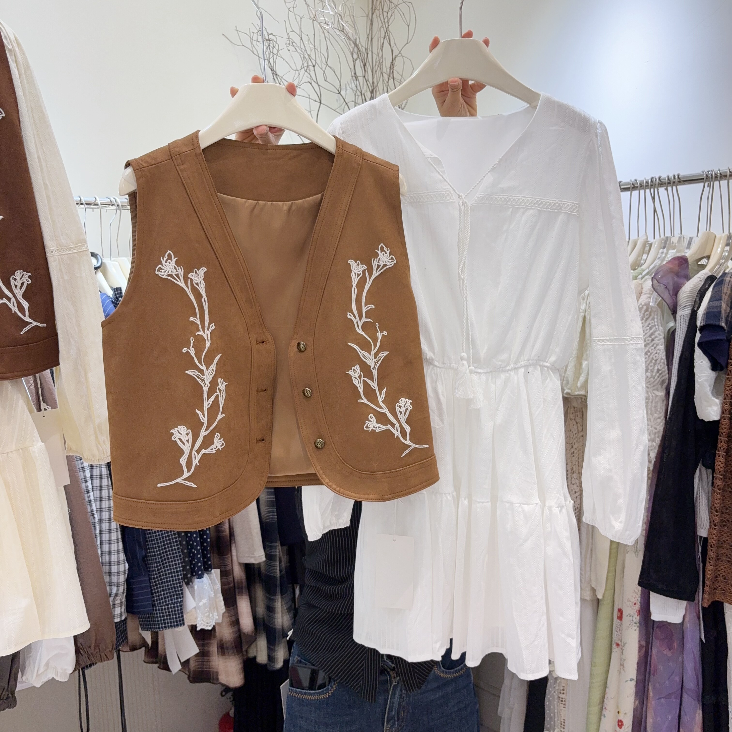 按头安利!小个子V领花朵刺绣牛仔马甲外套+系带长袖连衣裙两件套