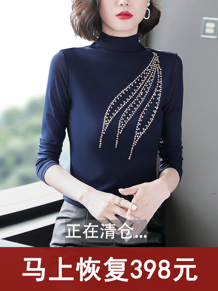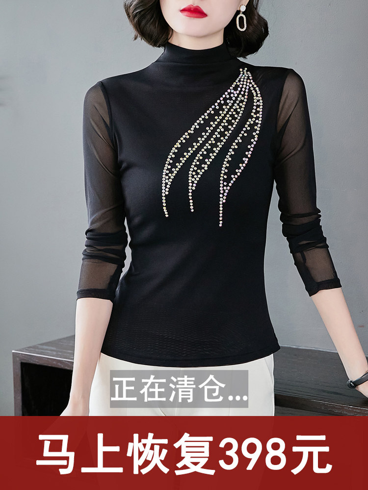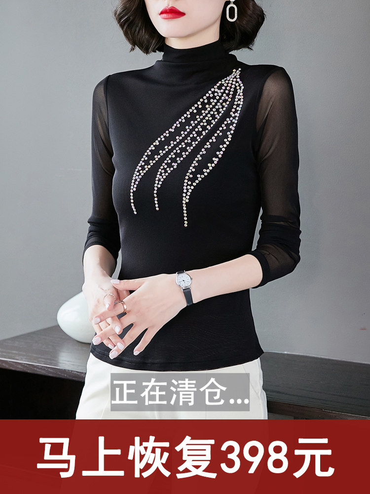 春装新款半高领网纱长袖打底衫女士时尚镶钻t恤小衫显瘦内搭上衣