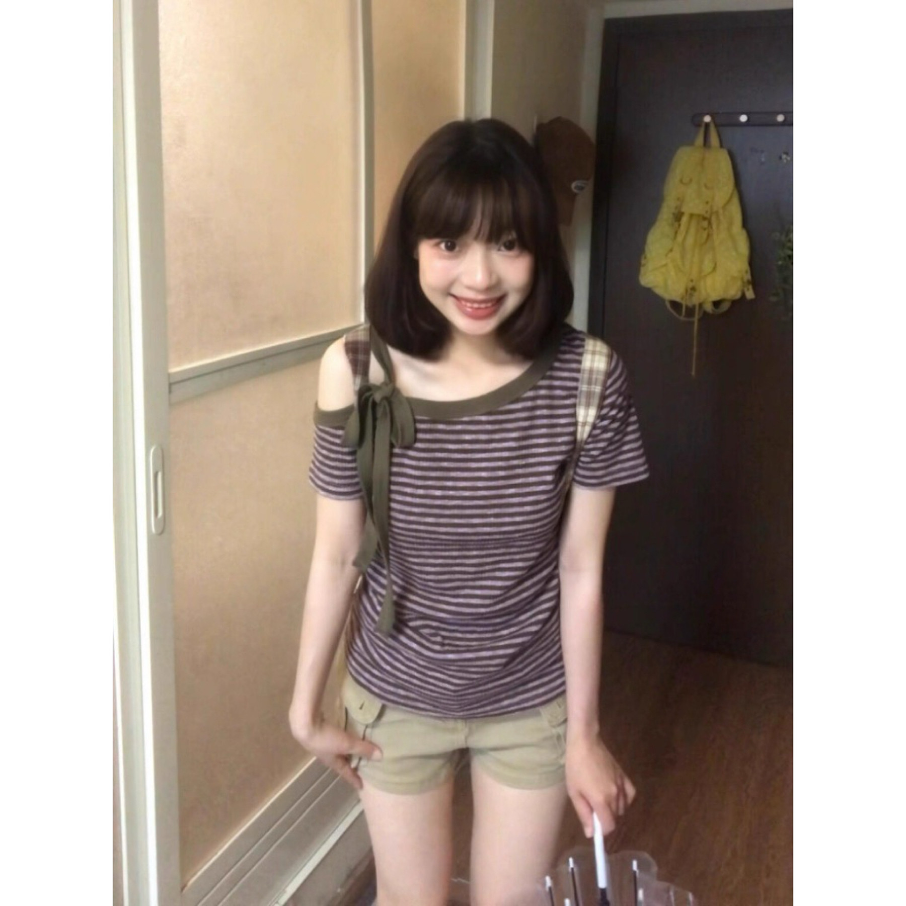 韩系紫色条纹斜肩短袖t恤女夏季甜辣风绑带设计感修身露肩上衣女