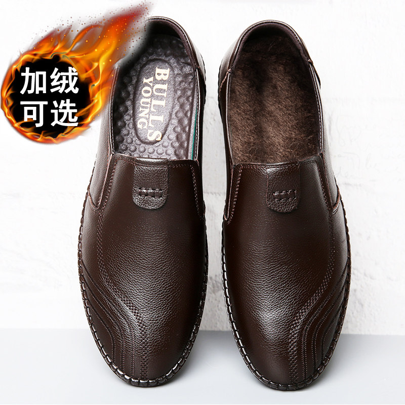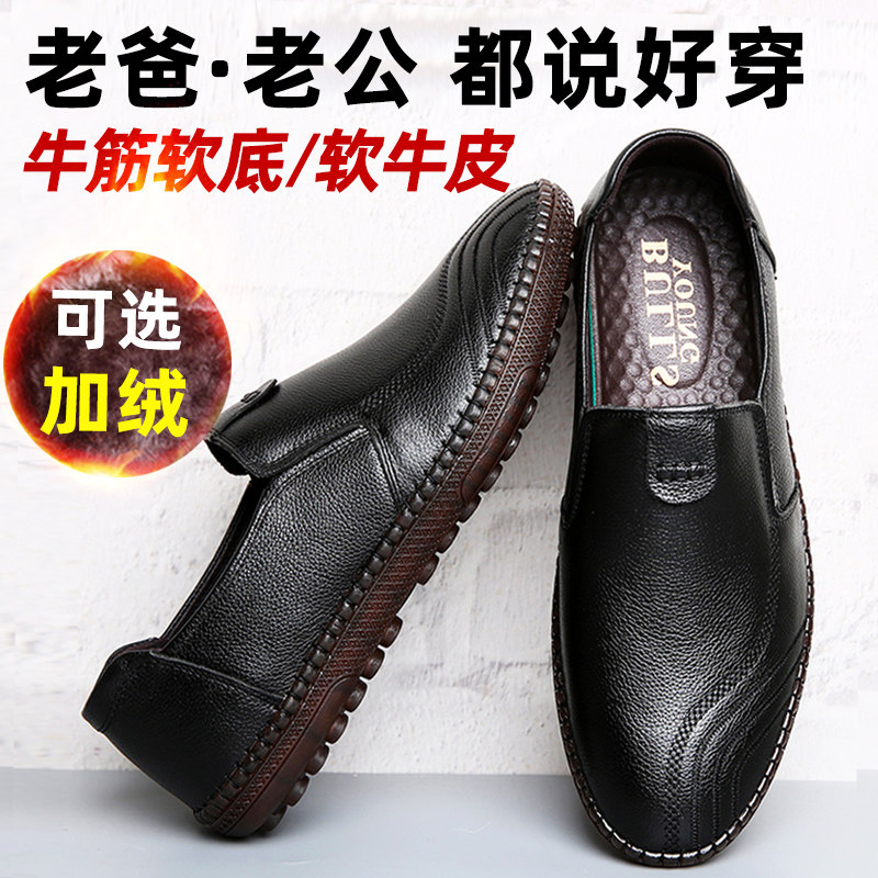 软底软皮鞋男士秋冬舒适爸爸中老年休闲鞋子加绒保暖防滑真皮男鞋