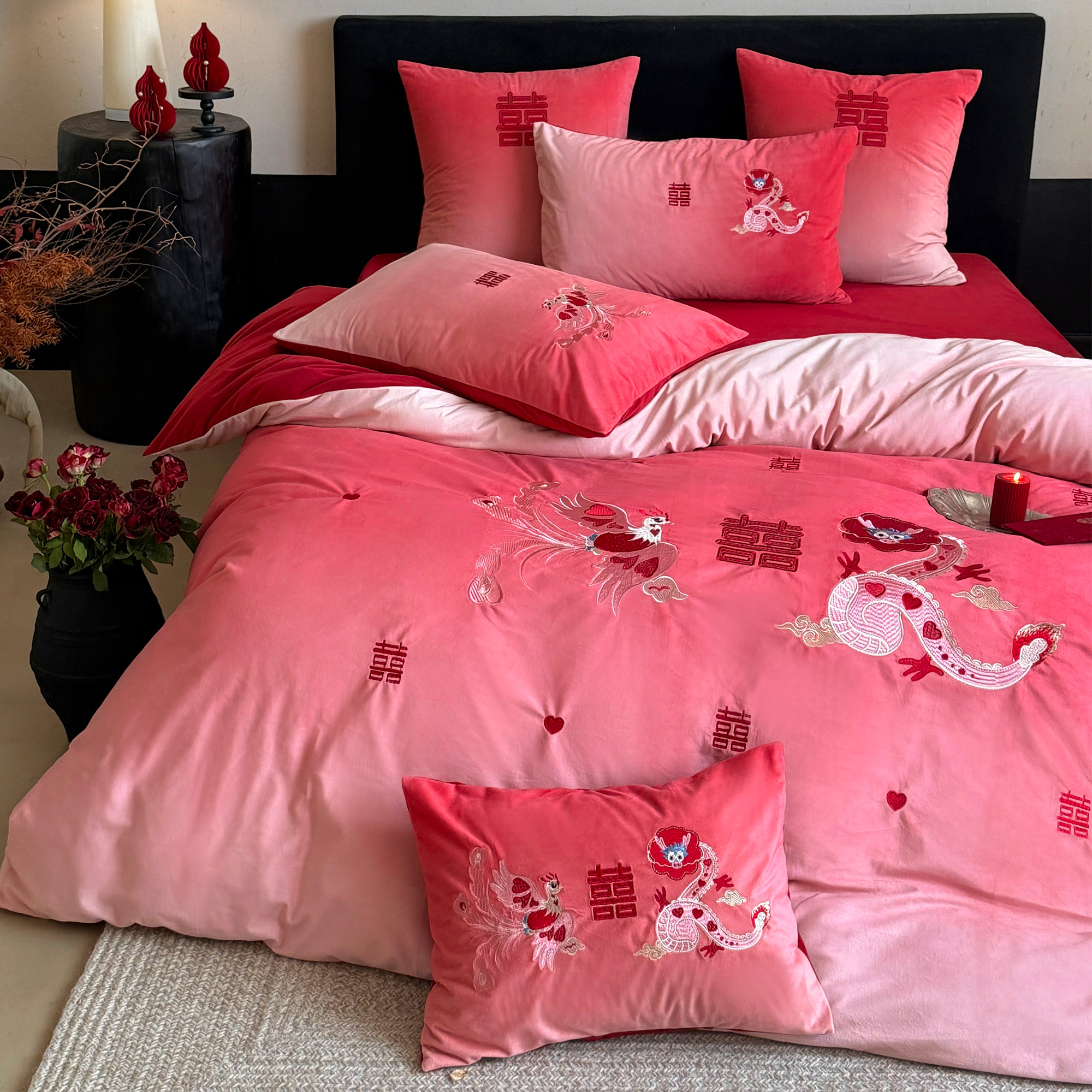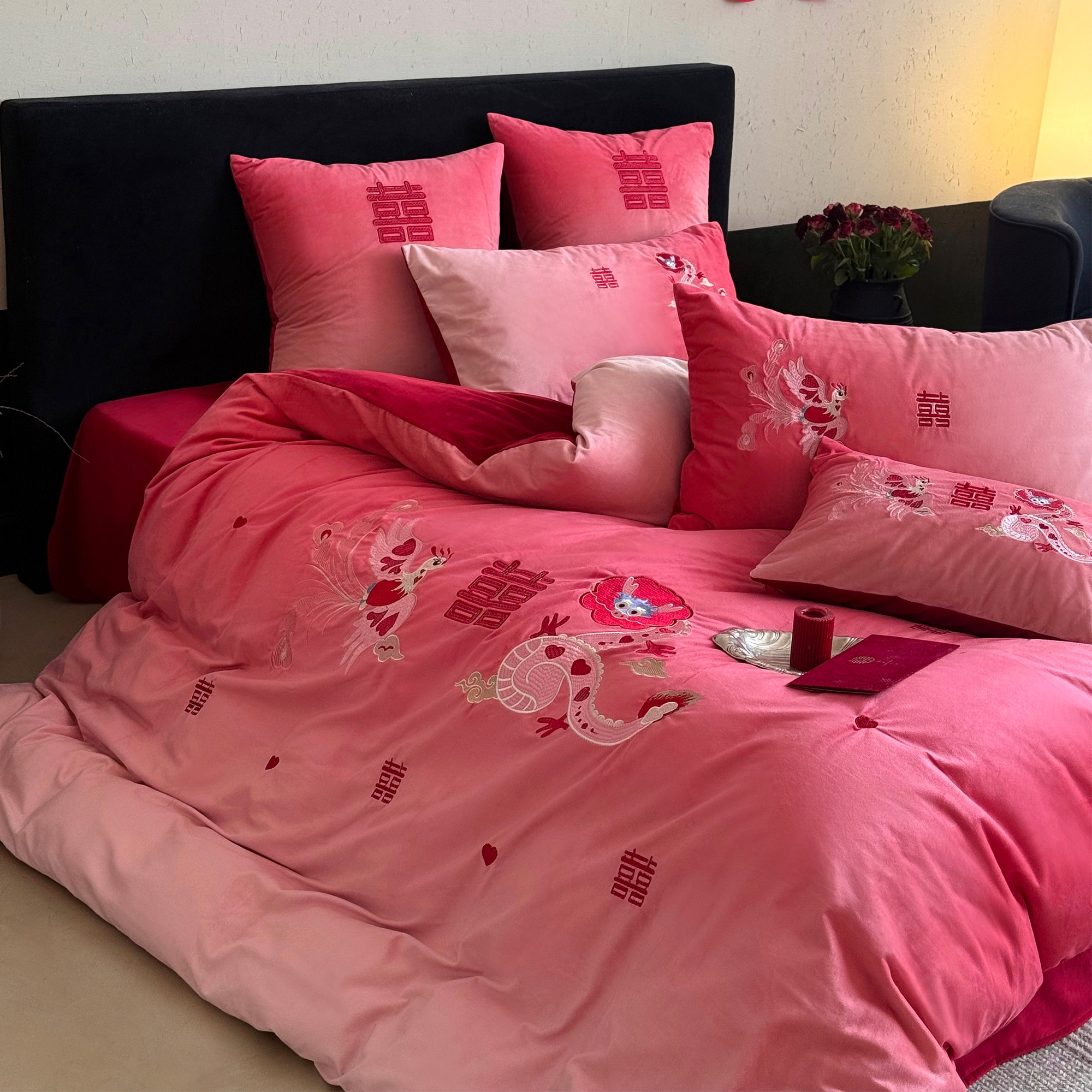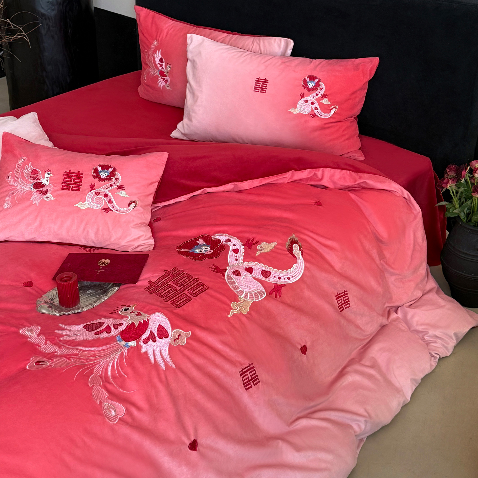 冬天结婚牛奶绒四件套卡通龙凤刺绣渐变红色婚庆被套保暖床单床盖