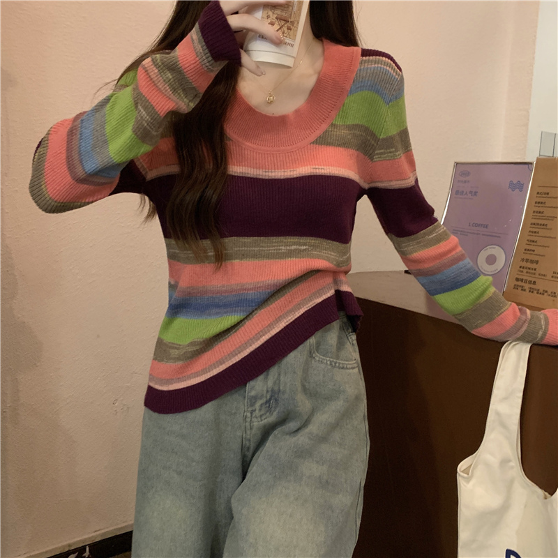 秋冬条纹圆领长袖打底针织衫上衣