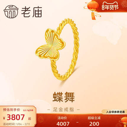 老庙黄金足金999蝶舞蝴蝶固口戒指5G彩虹拉丝梦幻浪漫时尚送女友