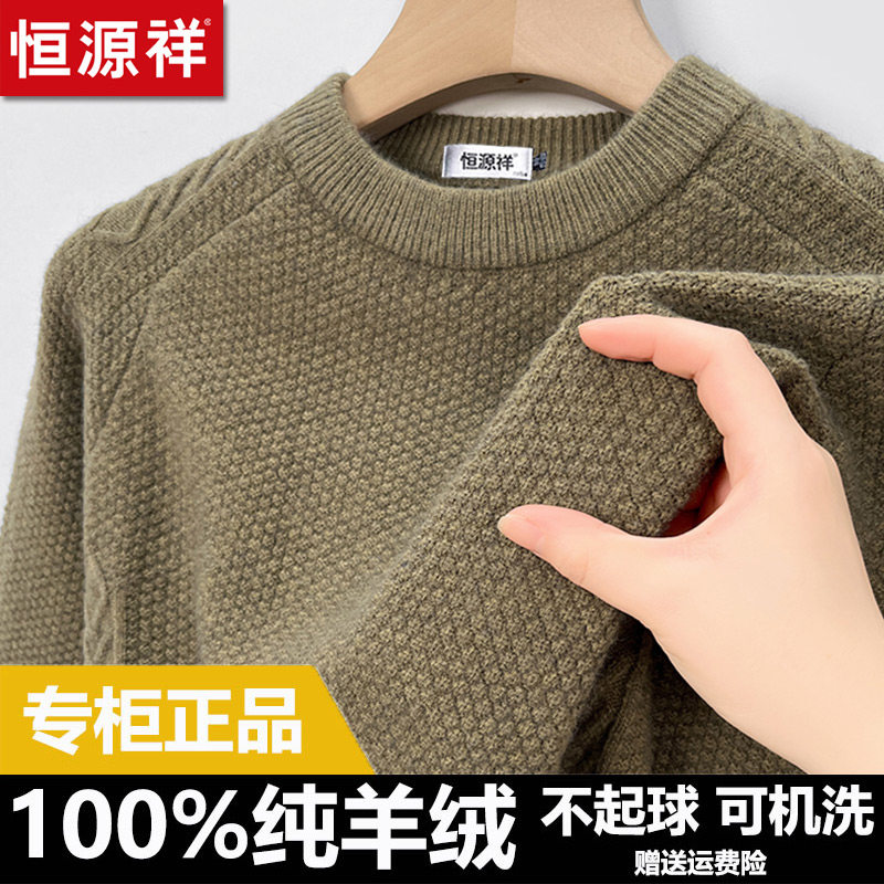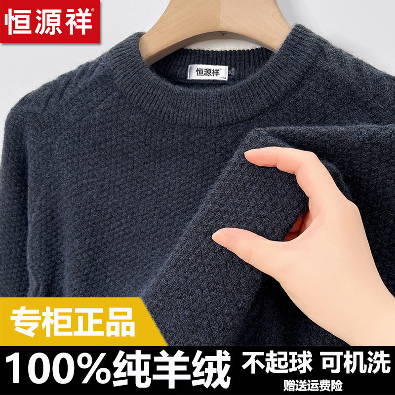 恒源祥冬季保暖加厚100%纯羊绒衫男士套头圆领中年针织毛衣打底衫