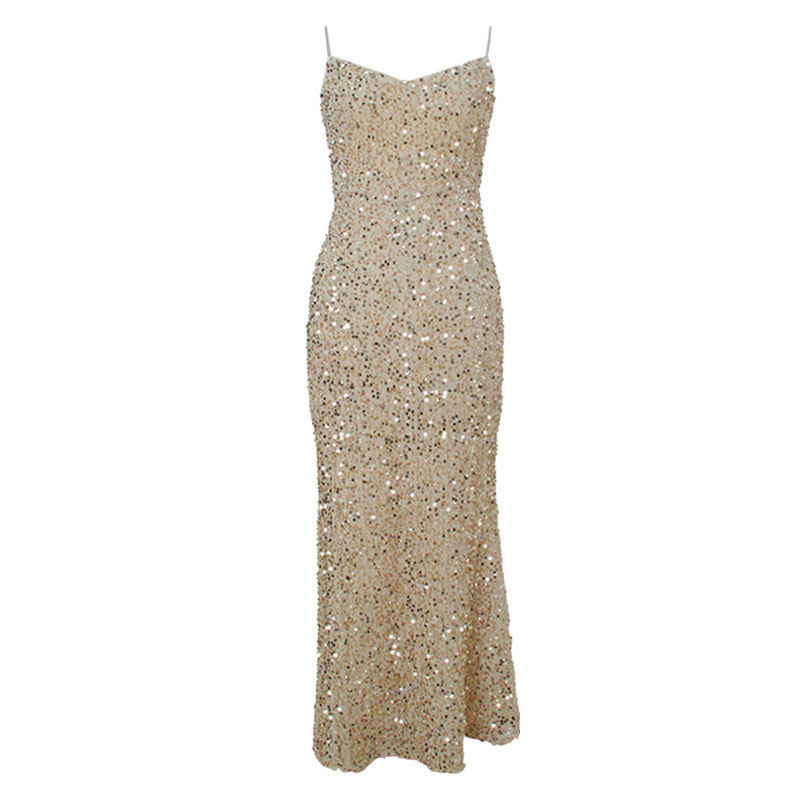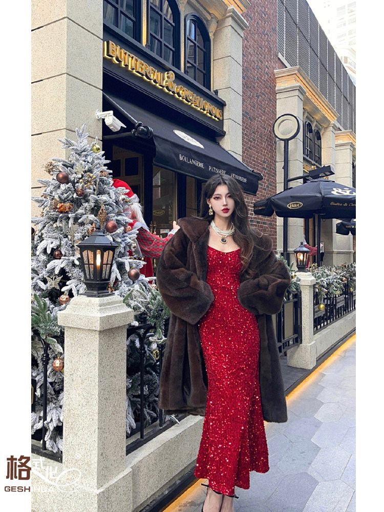 红色连衣裙礼服吊带裙平时可穿气质亮片丝绒鱼尾中长款宴会主持人