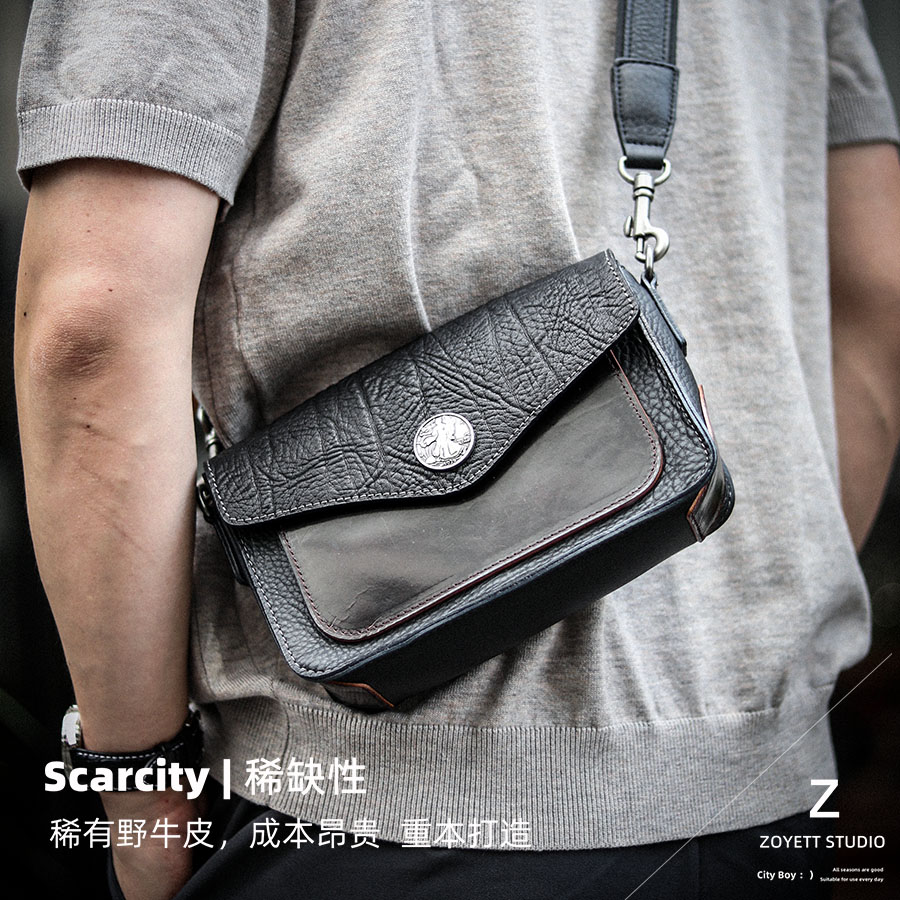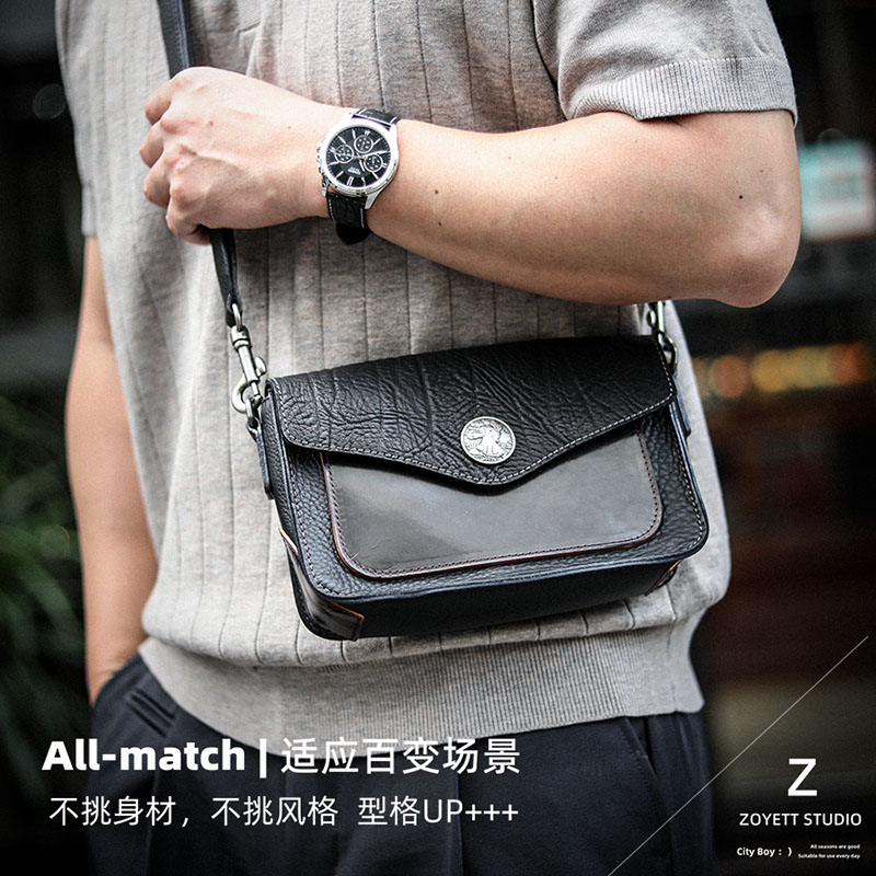 2025新款手工男士野牛皮复古单肩斜挎包真皮小方包随身手机小包潮