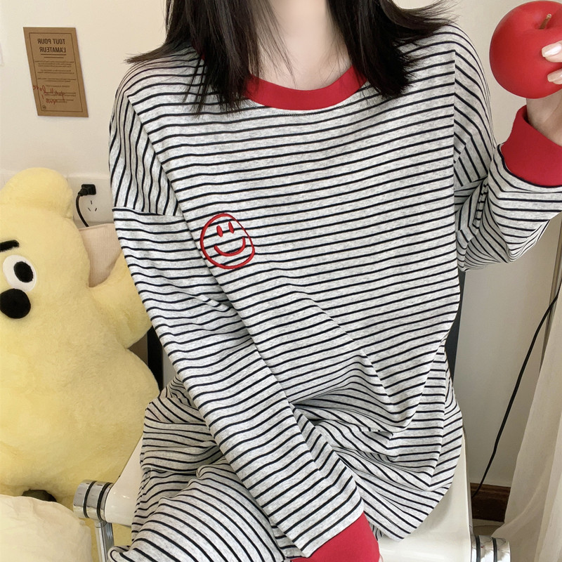 女纯棉笑脸条纹睡衣长袖套装秋