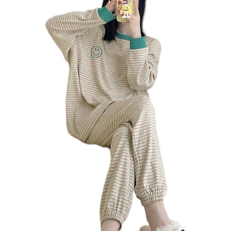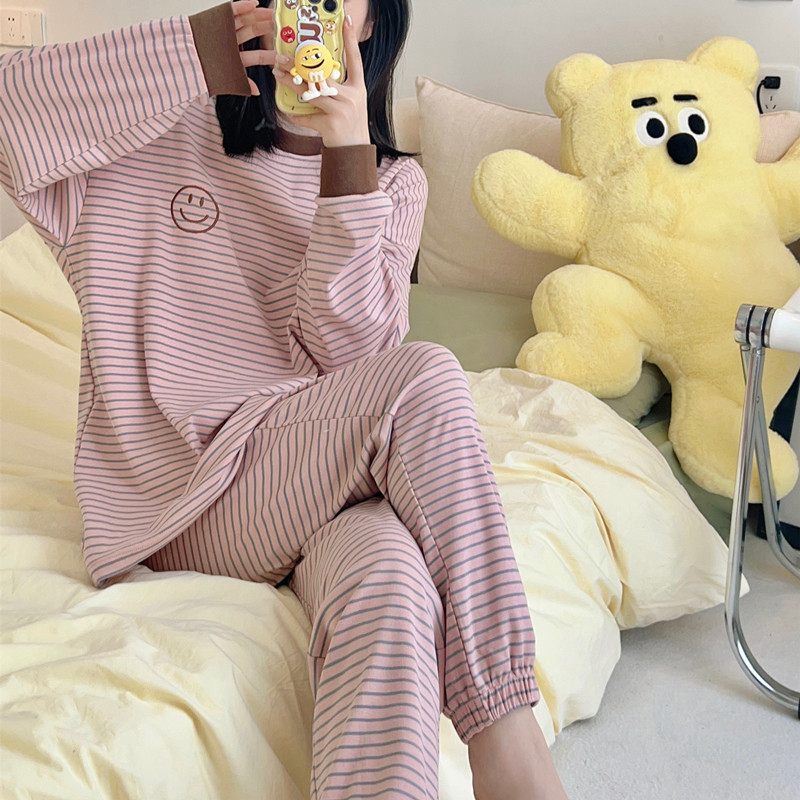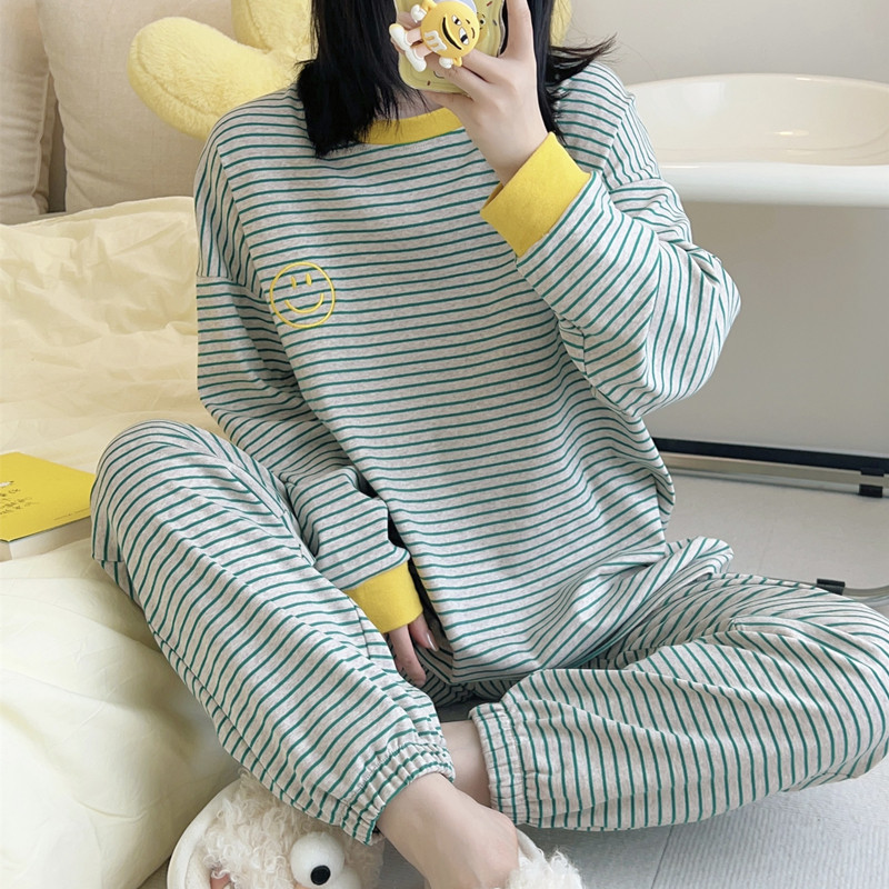 可爱笑脸条纹纯棉长袖长裤睡衣套装女宽松休闲可外穿家居服春秋