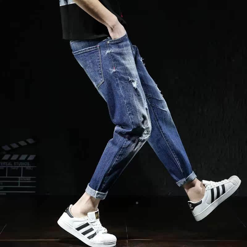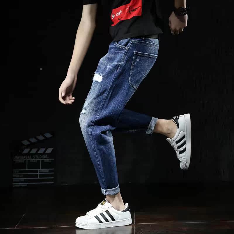 纯棉破洞九分牛仔裤男宽松小脚加肥加大码胖子哈伦显瘦弹力9分裤
