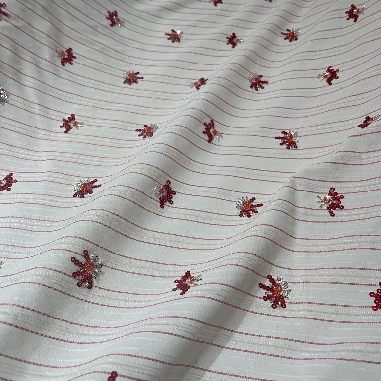 正红色欧美休闲千金风南法条纹衬衫休闲棉布碎花刺绣珠片绣花布