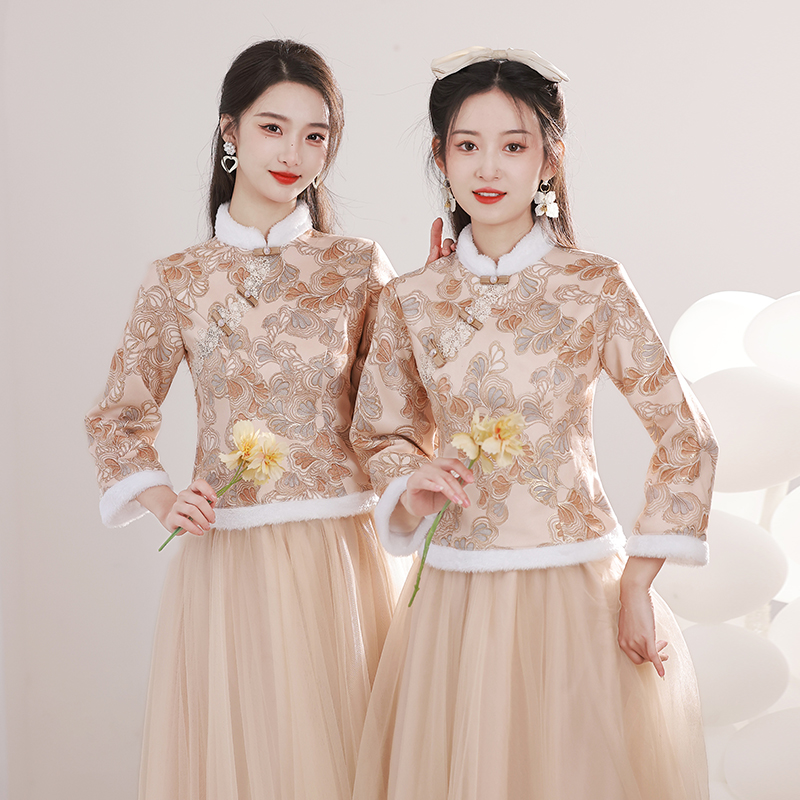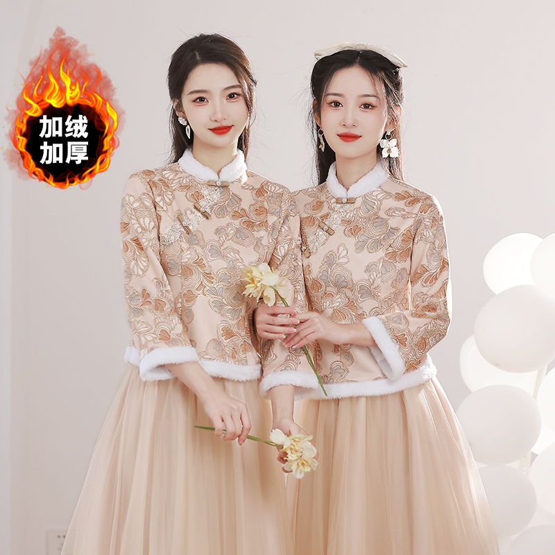 中式伴娘服女2025新款姐妹团礼服长袖保暖旗袍显瘦国风高级伴娘裙
