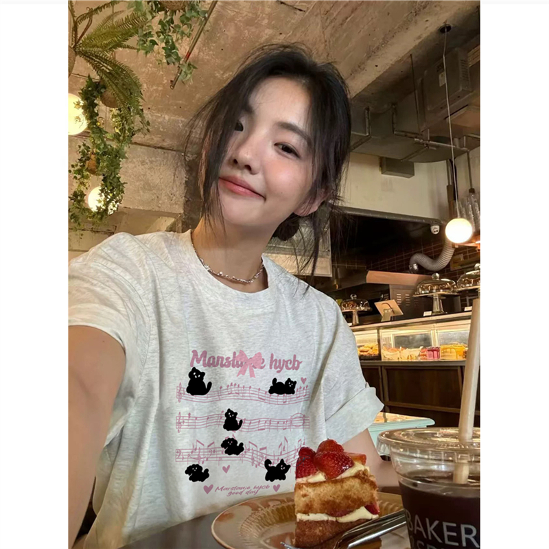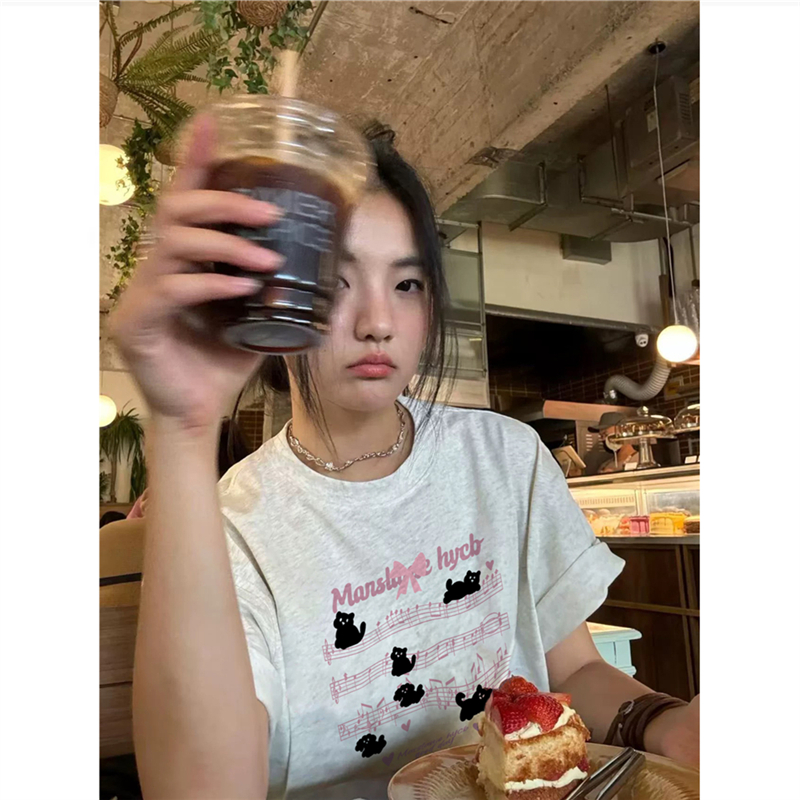 纯棉美式复古卡通正肩短袖t恤女宽松小众设计感港味chic半袖体恤