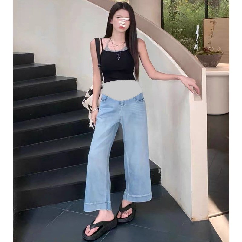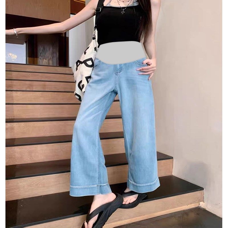 孕妇牛仔裤夏春秋薄款托腹九分裤大码宽松直筒裤外穿阔腿裤打底裤