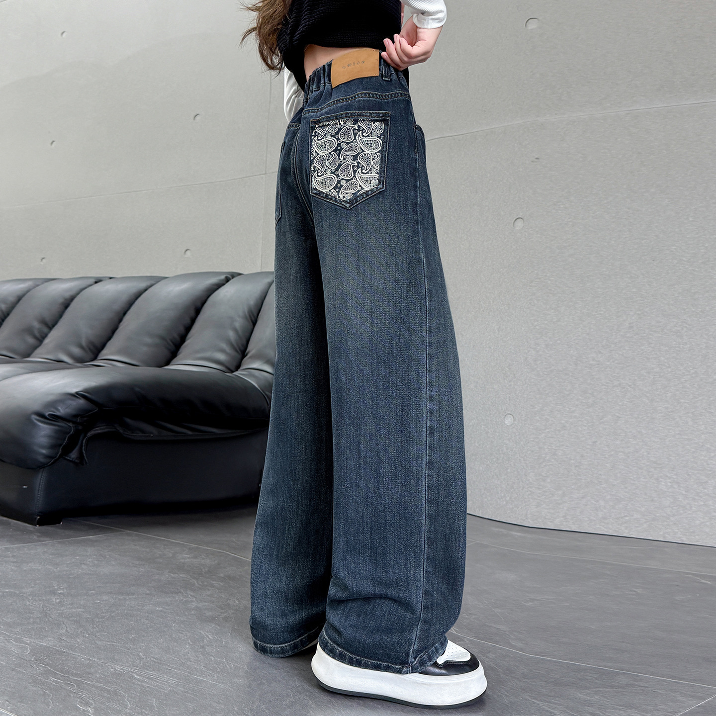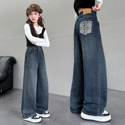 女童裤子春秋款2025新款儿童秋季直筒阔腿裤初中生女孩好看牛仔裤
