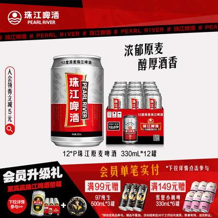 珠江啤酒12度原麦330ml*12罐装拉格整箱官方旗舰店