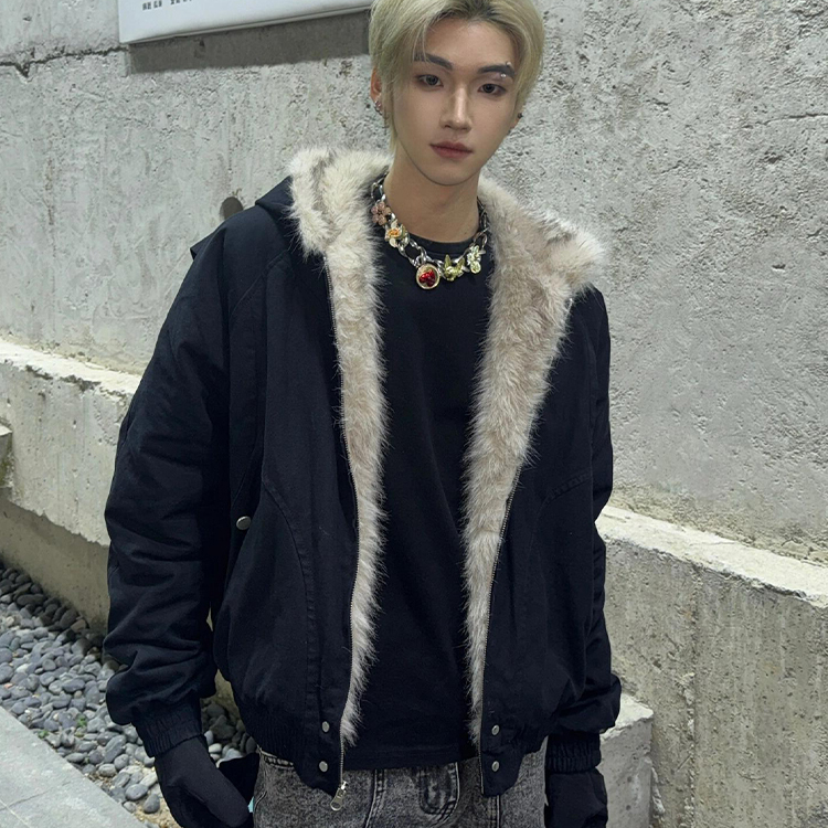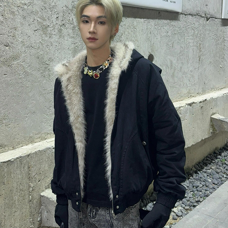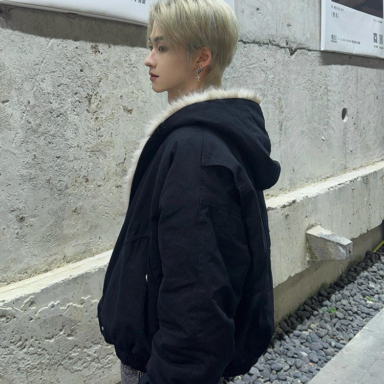 黑色短款连帽座山雕毛领棉服男冬季加厚保暖美式复古廓形棉衣外套
