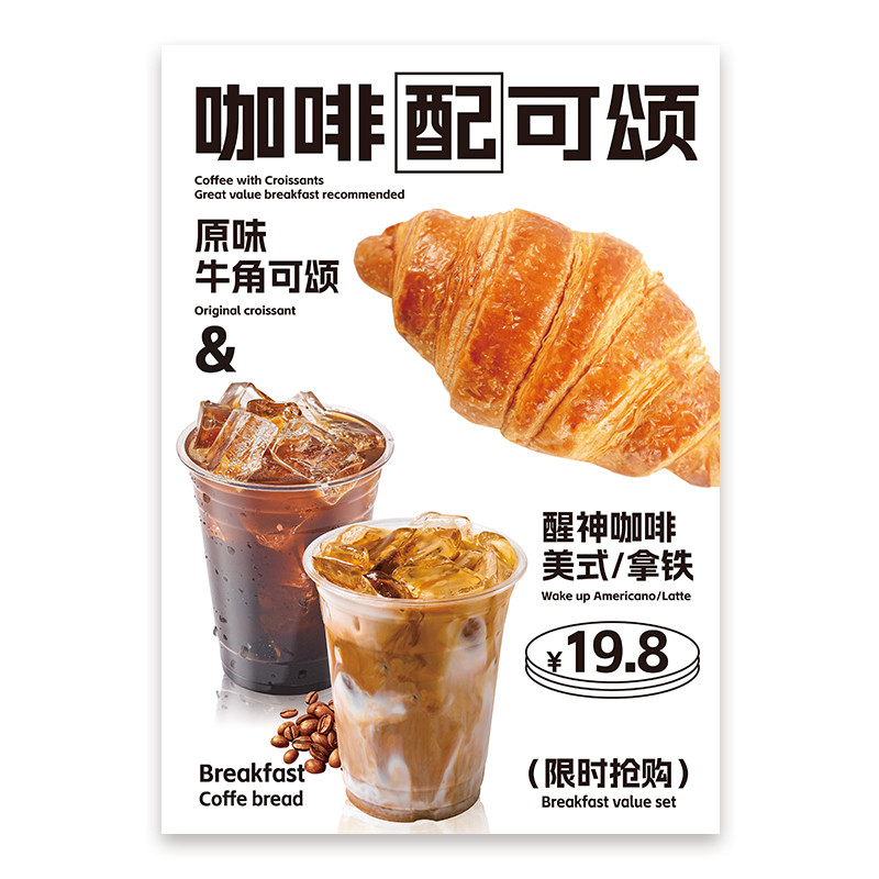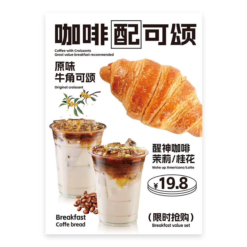 牛角包咖啡组合早餐 牛角包美式海报 茉莉拿铁桂花拿铁图PSD格式