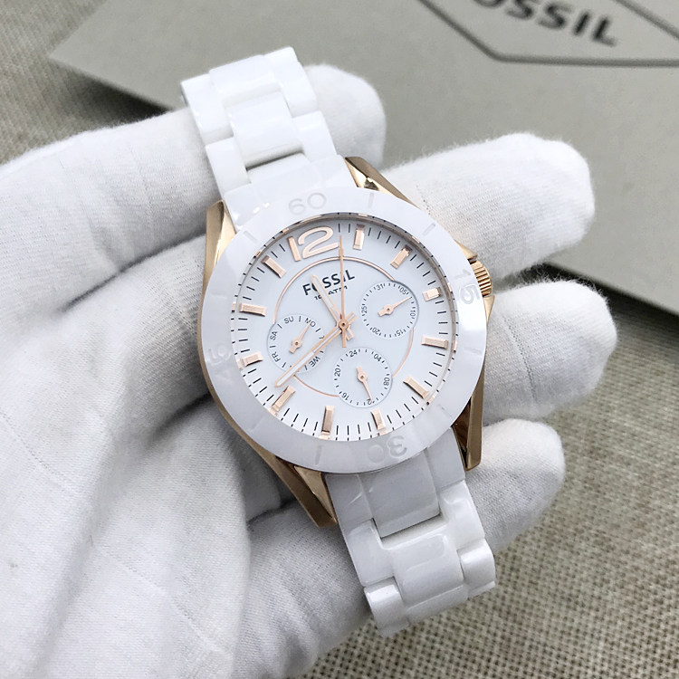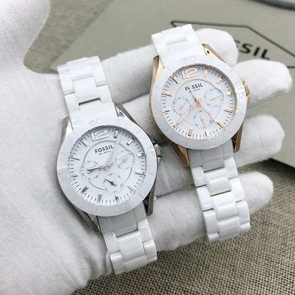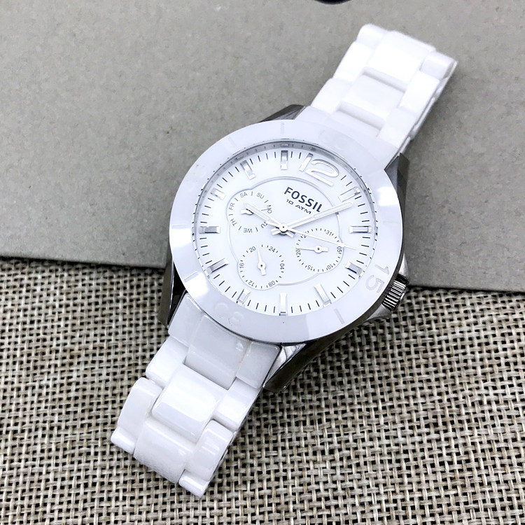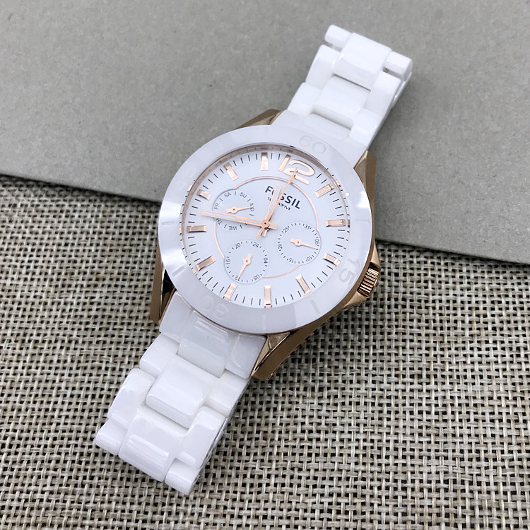 FOSSIL手表白色陶瓷三眼多功能星期日历石英表商务休闲女表CE1006