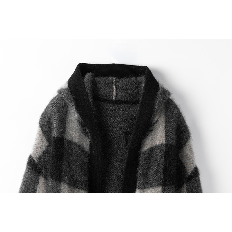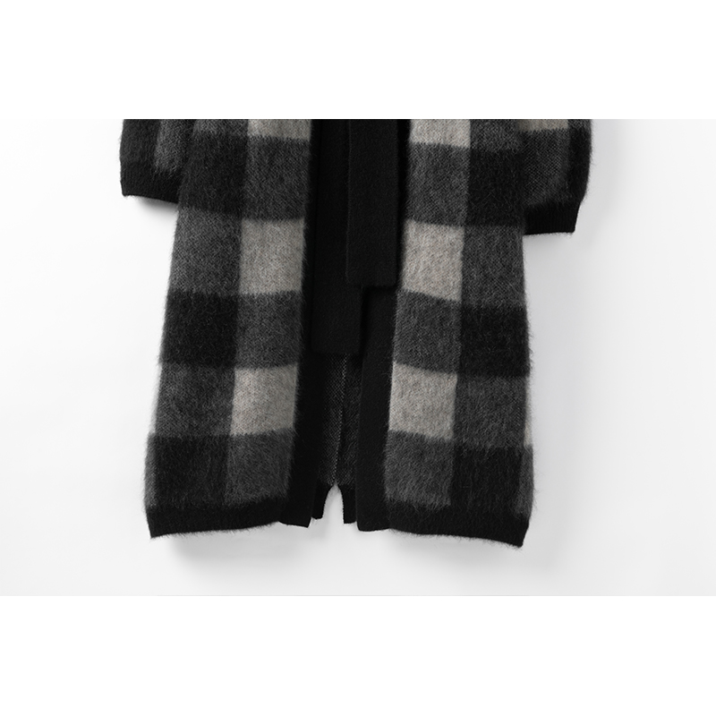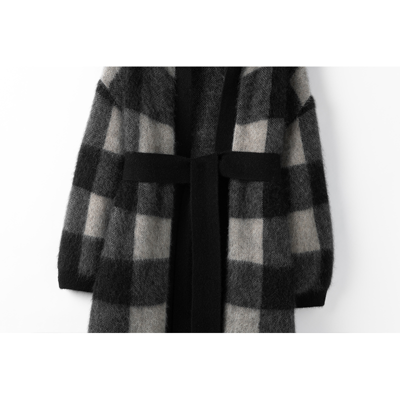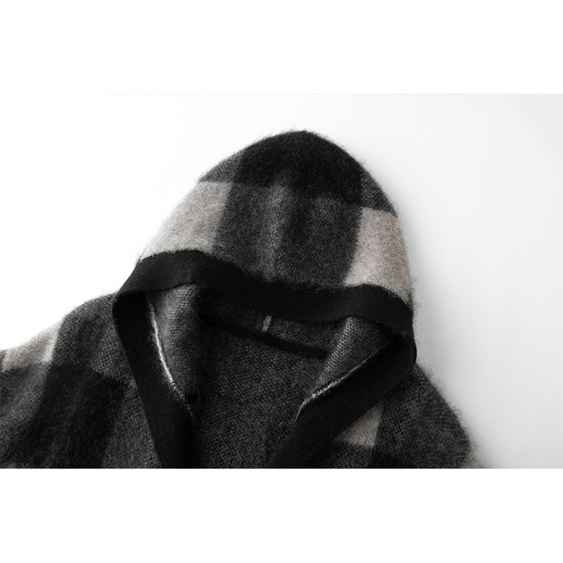萨琪尼气质名媛~格子拼色针织连帽羊绒大衣100%纯山羊绒长款外套