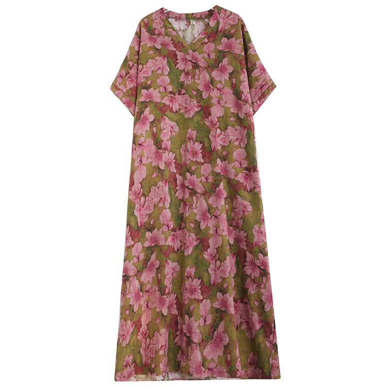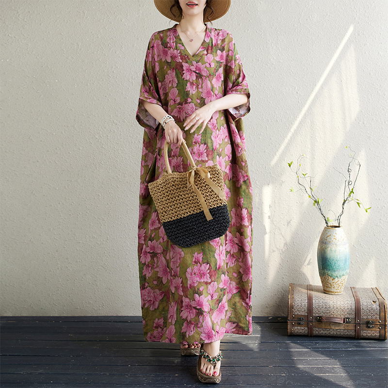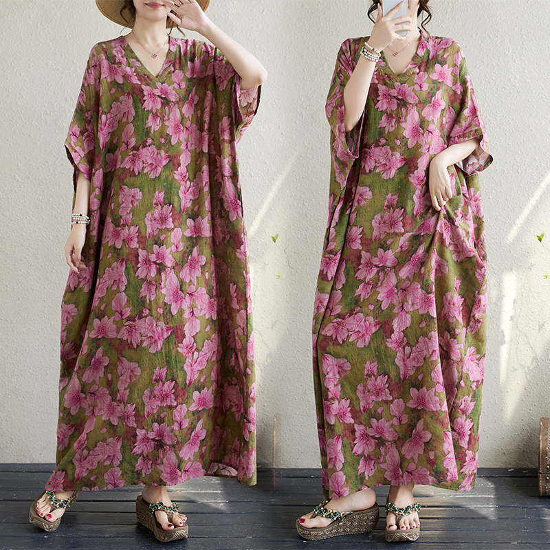 外贸出口加肥加大夏季花色度假风旅游V领复古长裙遮肉棉麻连衣裙