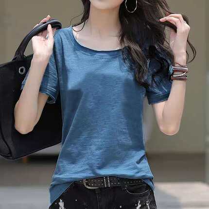 100%纯棉竹节棉夏装新款t恤韩版圆领短袖白色宽松体恤女
