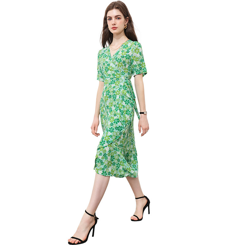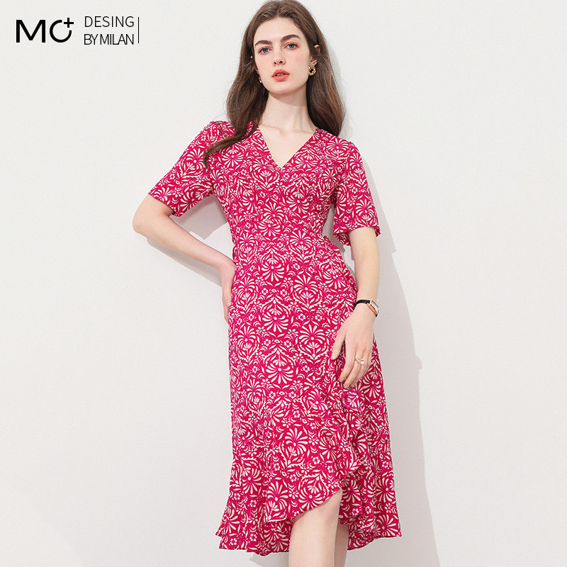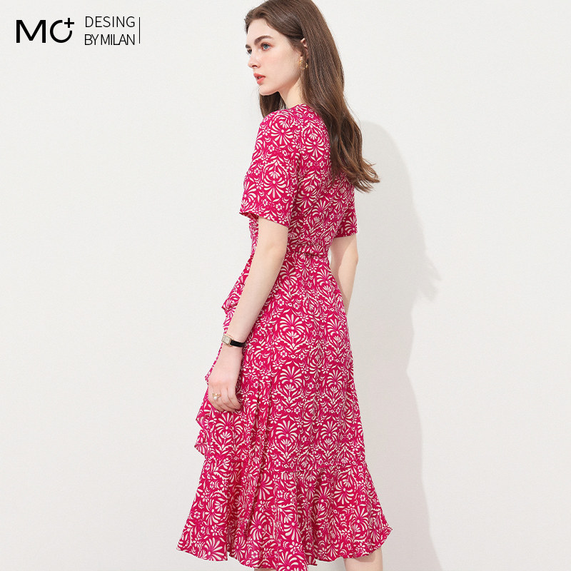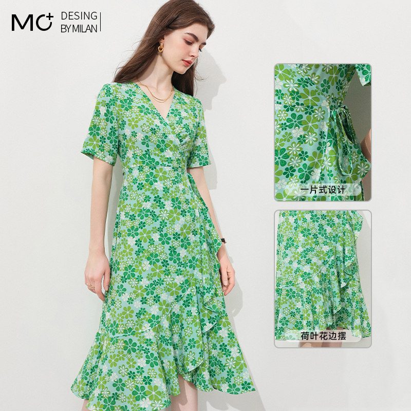 MO+/沫加夏季新款V领蝴蝶结系带印花一片式鱼尾裙雪纺碎花连衣裙