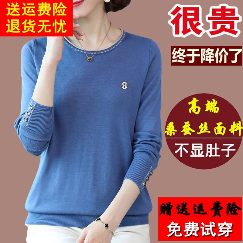 大牌桑蚕丝t恤女长袖妈妈装宽松大码上衣春秋薄款内搭打底针织衫