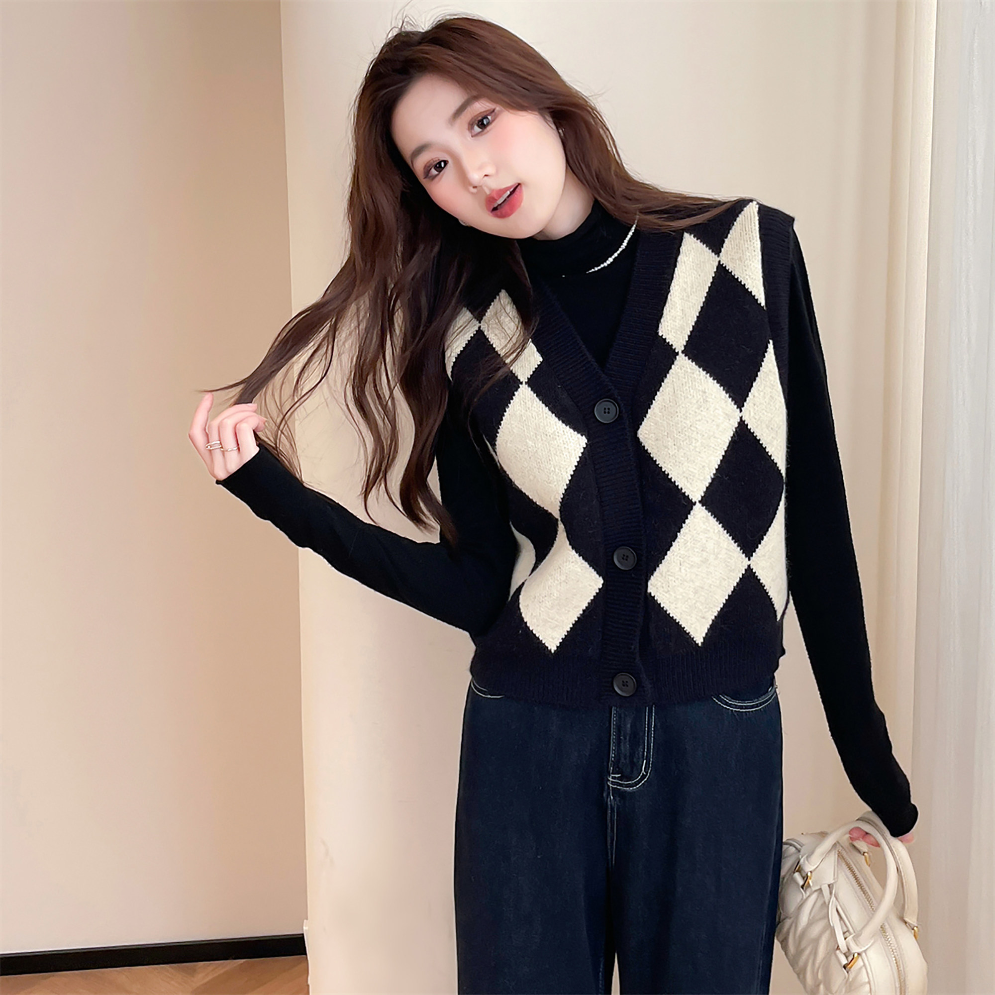 唐狮复古菱格V领开衫马甲背心女2025新款秋冬季英伦风内搭毛衣qd
