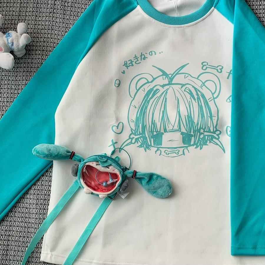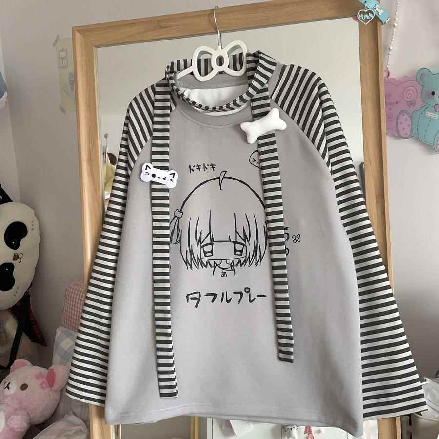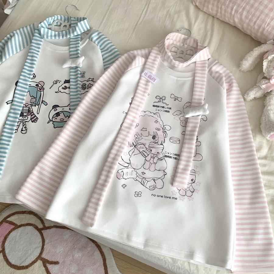 原创日系甜美可爱圆领加绒卫衣女宅萌系加厚条纹纯棉外套长袖上衣