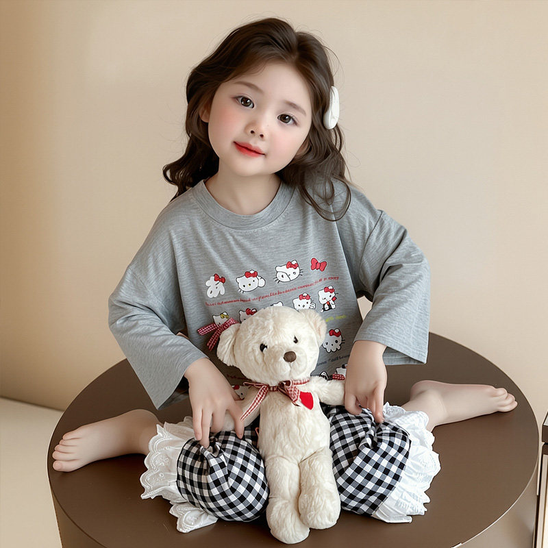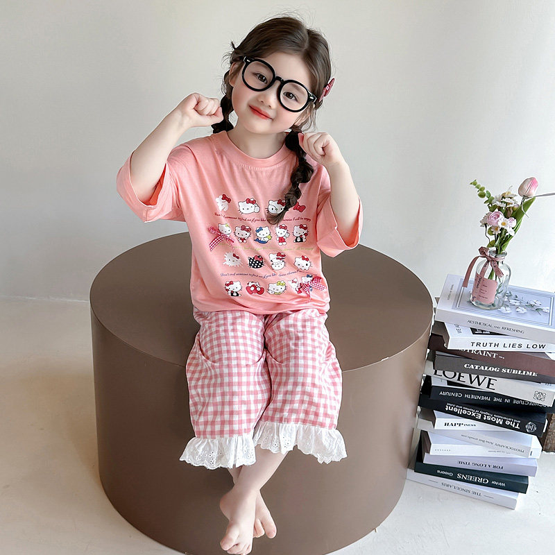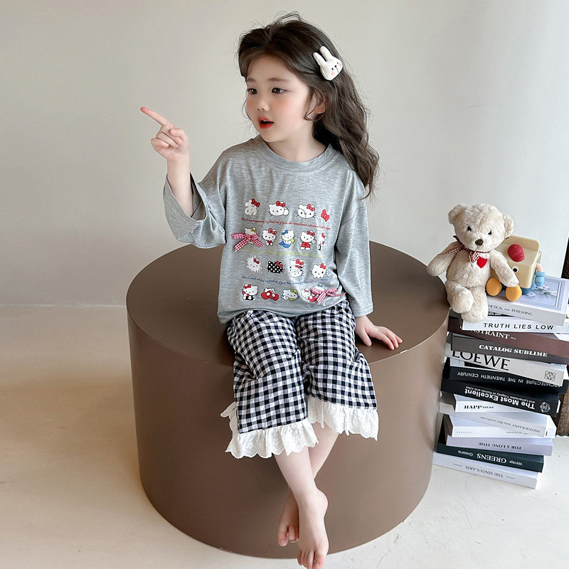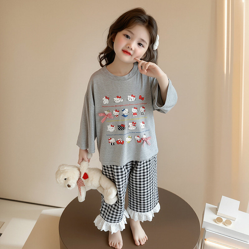 女童睡衣夏季2025新款冰丝莫代尔女宝纯棉女孩儿童格子家居服套装