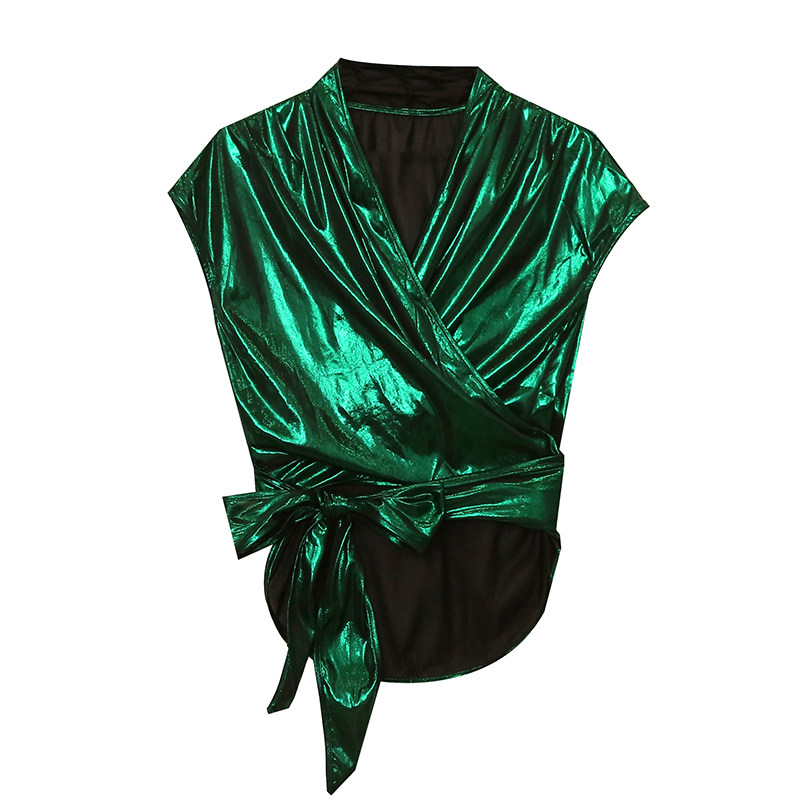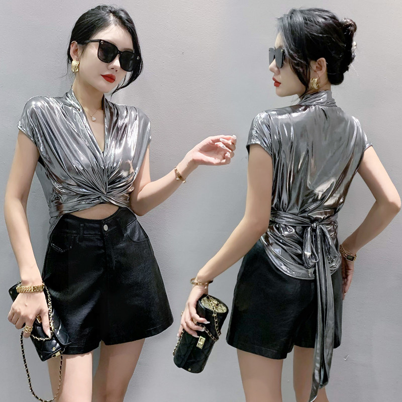 2023夏季设计感百搭绑带修身显瘦短款上衣时尚亮面纯色短袖T恤女