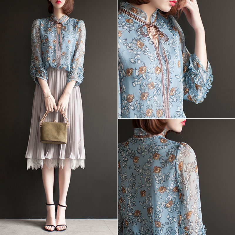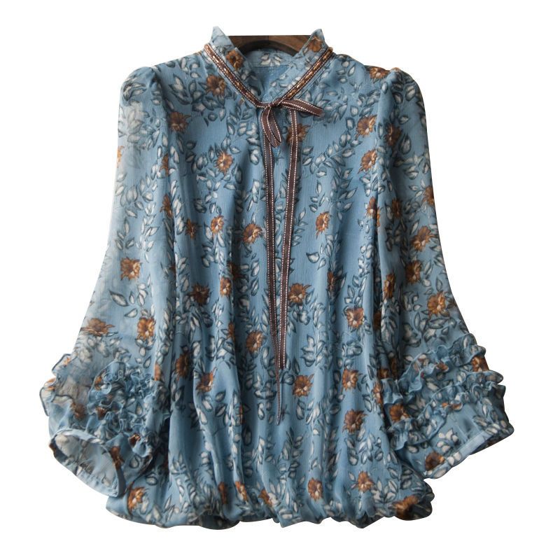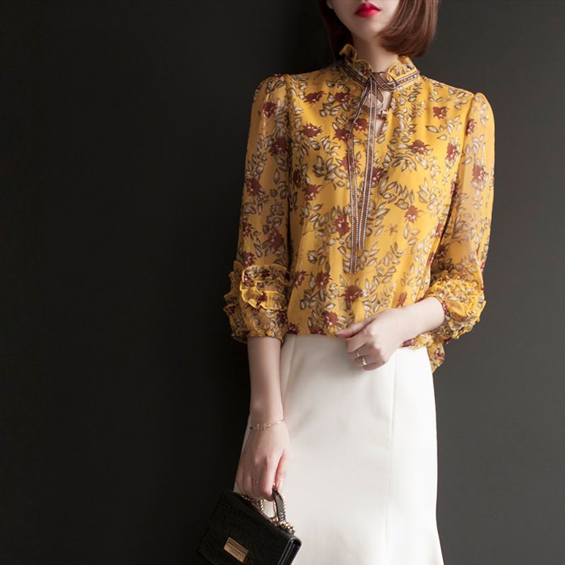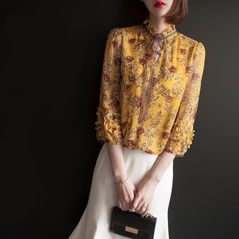洋气小衫女2023春装新款复古灯笼袖打底衫女装收腰上衣碎花雪纺衫