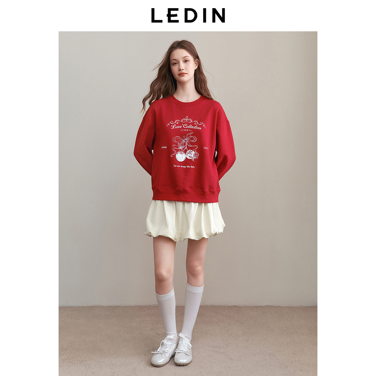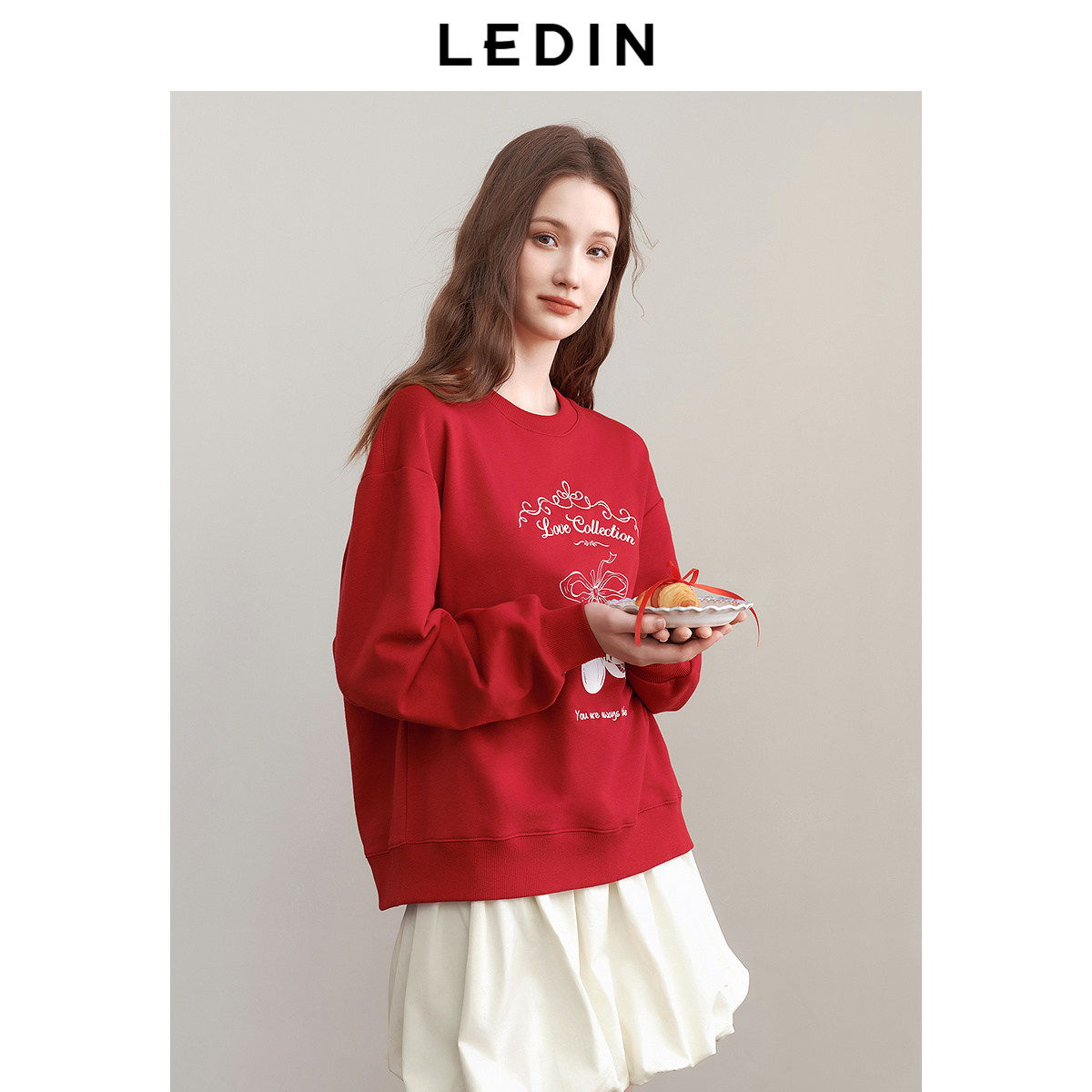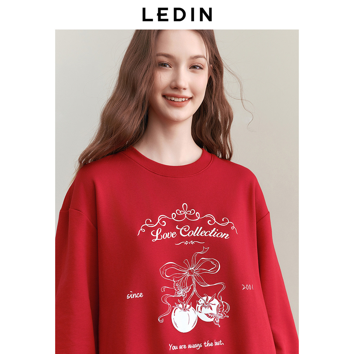 乐町新年红色圆领卫衣2025春季新款宽松卫衣卡通字母印花休闲上衣