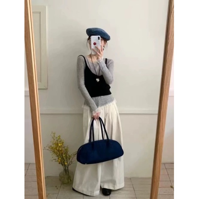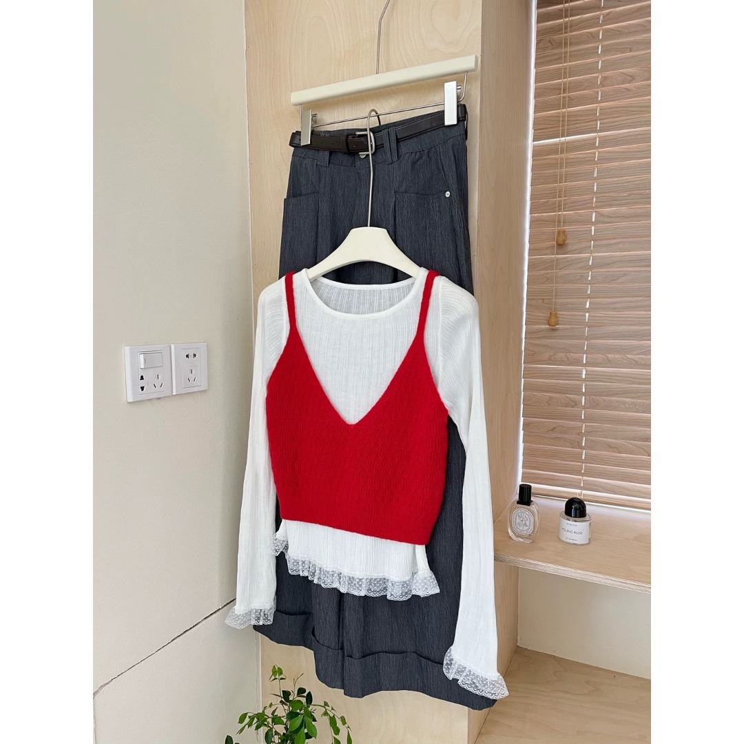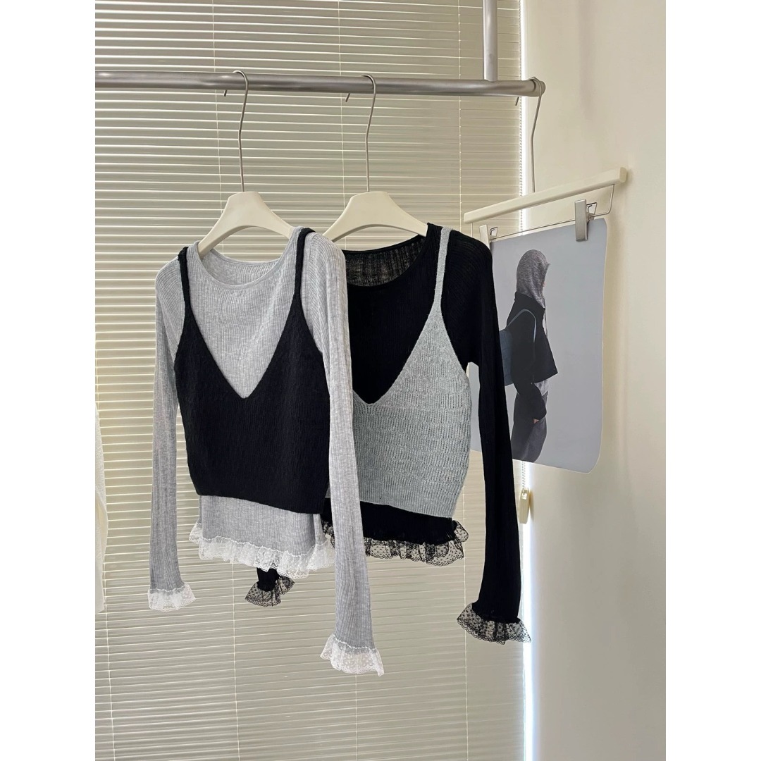 十三行2025秋冬新款叠穿短款v领针织衫马甲背心蕾丝长袖两件套女