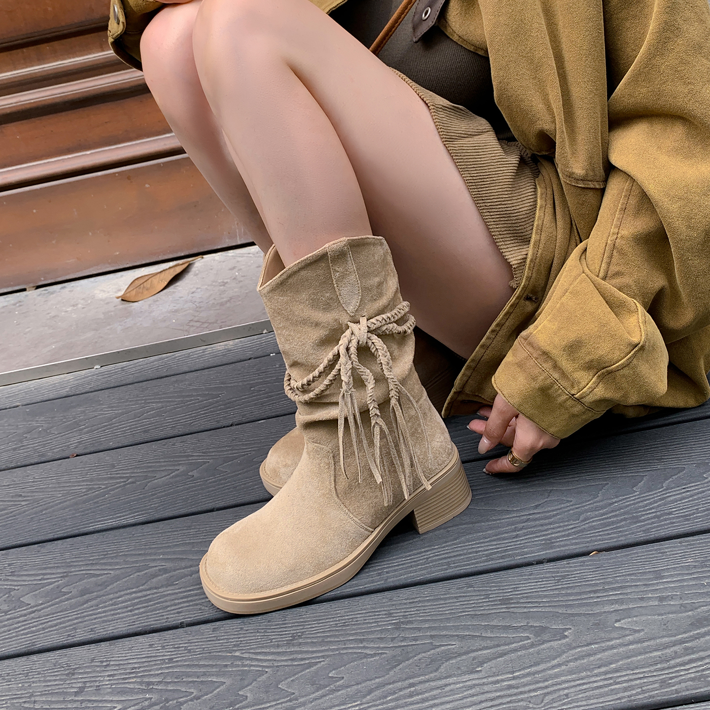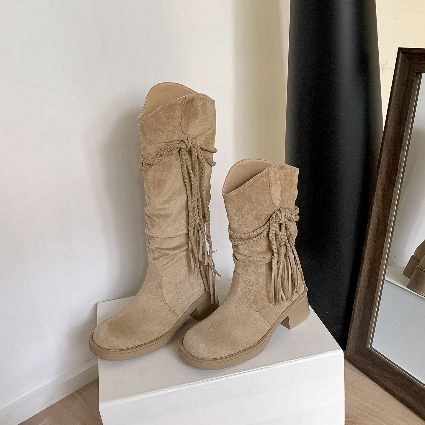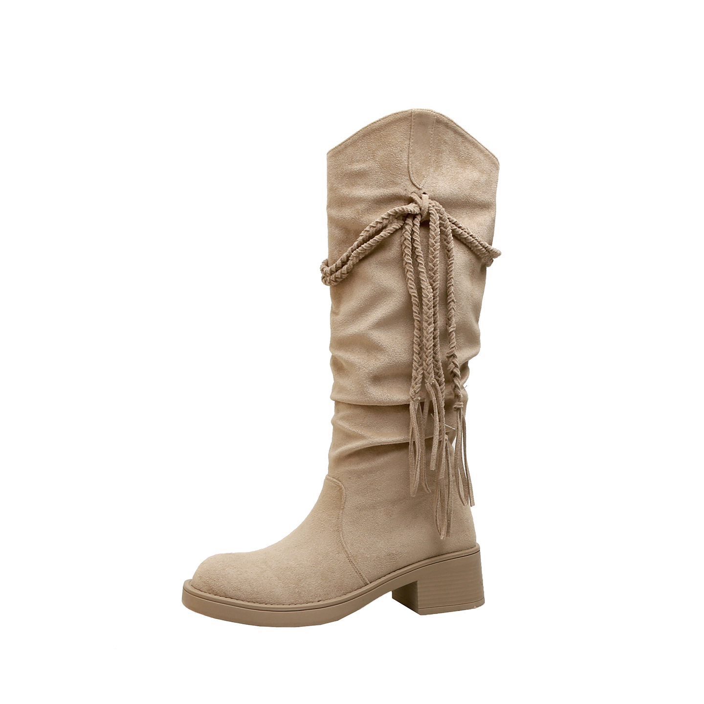 2025秋冬上新埃及靴流苏粗跟中高筒长靴西部牛仔靴女堆堆瘦瘦靴子