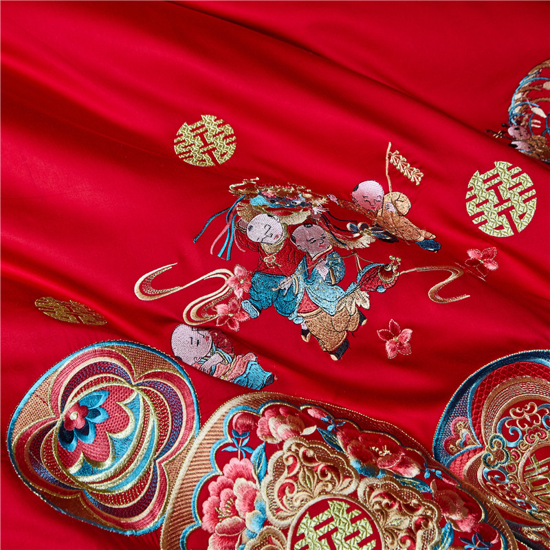 百子图四件套结婚喜庆大红贡缎刺绣子孙被喜被纯棉百子被婚庆用品