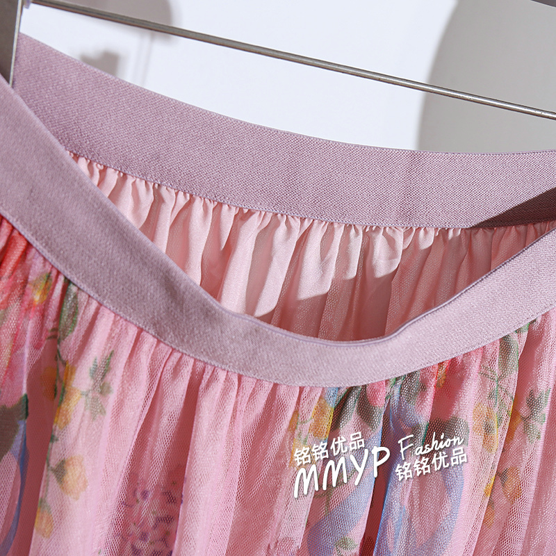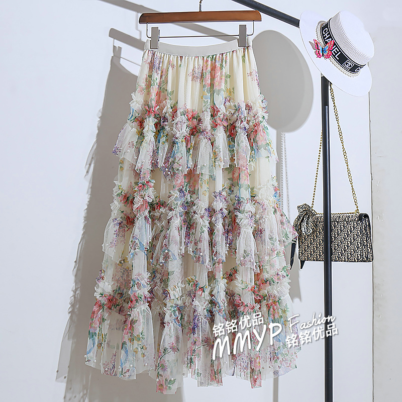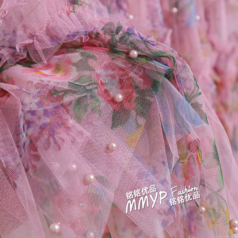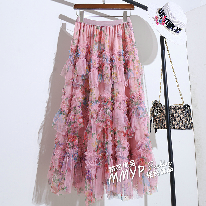 新款绝美粉色钉珠网纱仙女裙半身裙女秋2025新款印花纱裙蓬蓬长裙