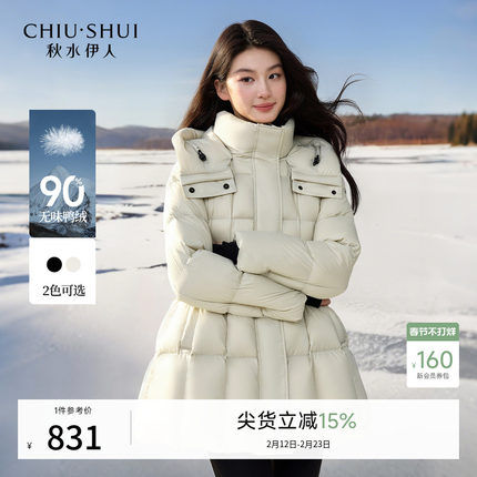 秋水伊人连帽白色长款羽绒服女2025冬季新款气质通勤抽绳保暖外套