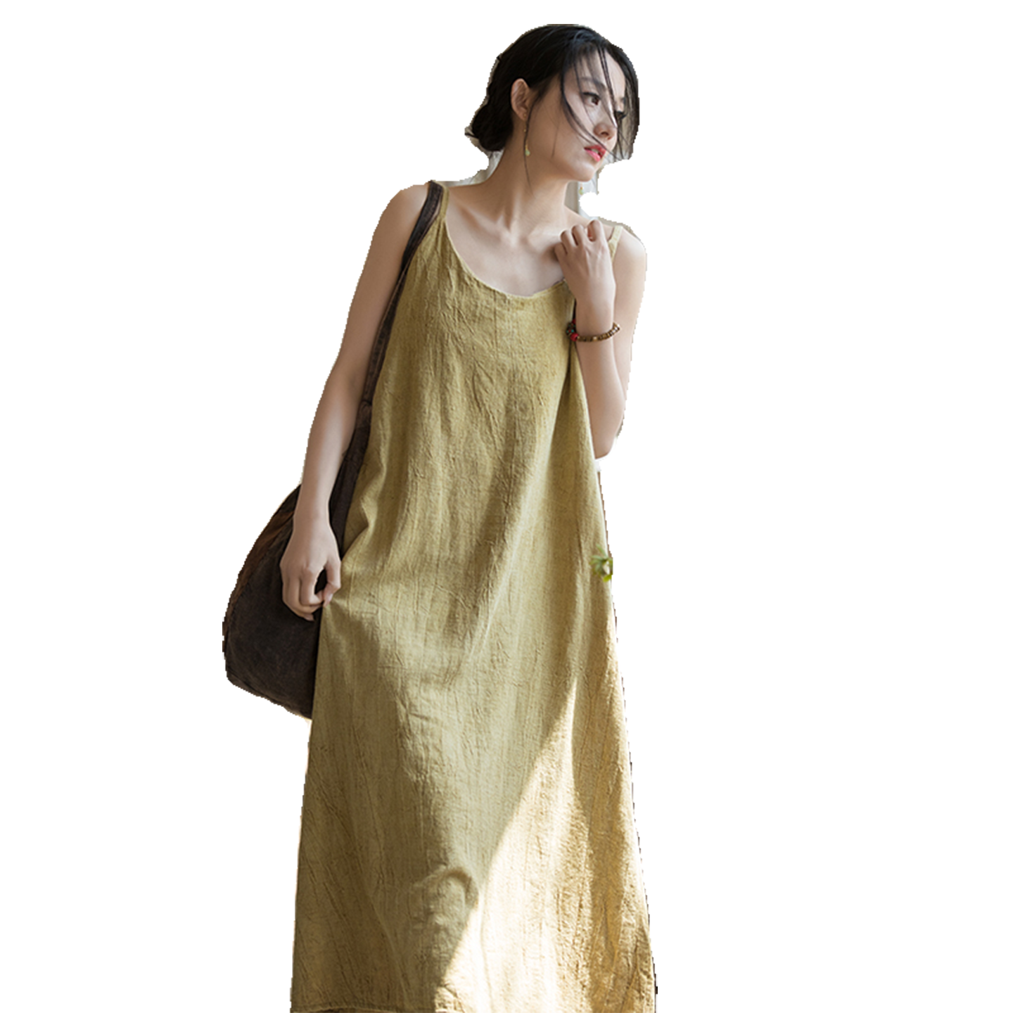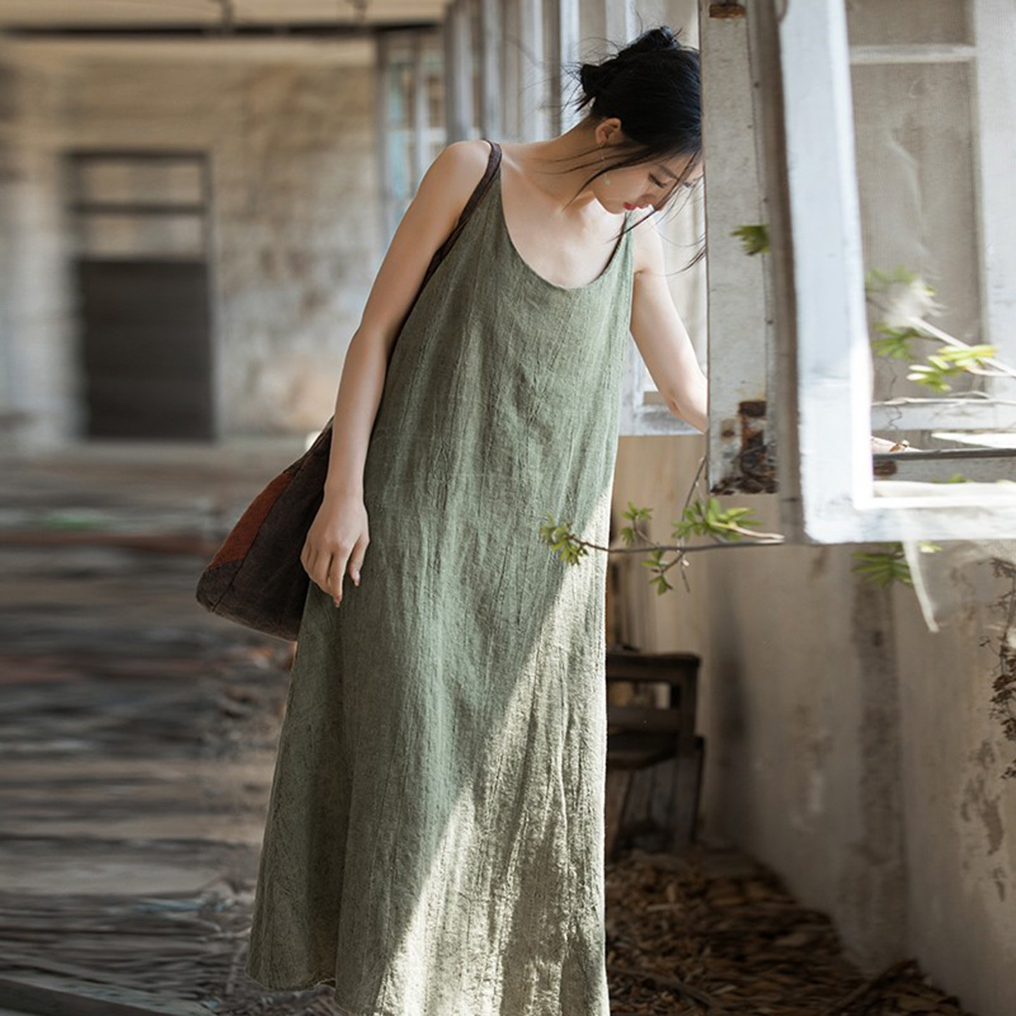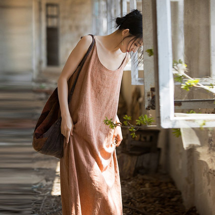 亚麻薄款百搭文艺旅行吊带连衣裙