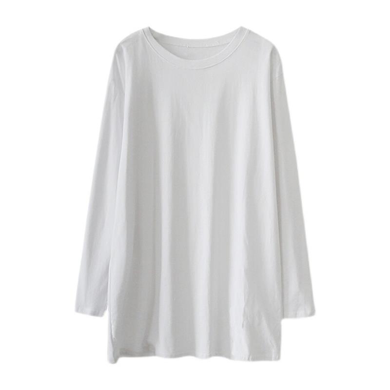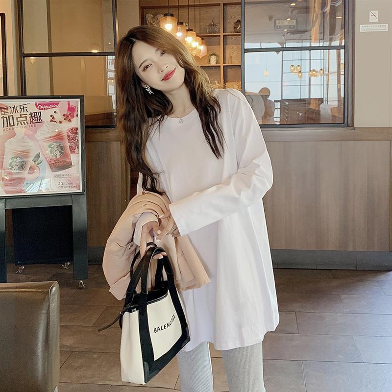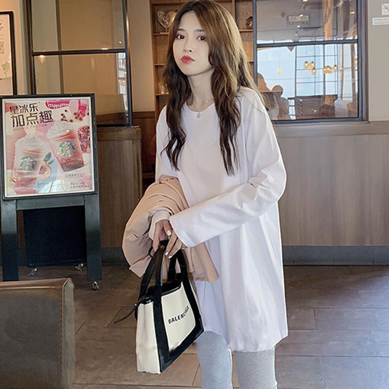 2025秋冬新款韩版纯棉春秋新款白色长袖t恤女圆领上衣宽松中长款i