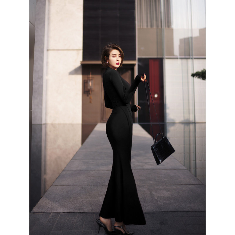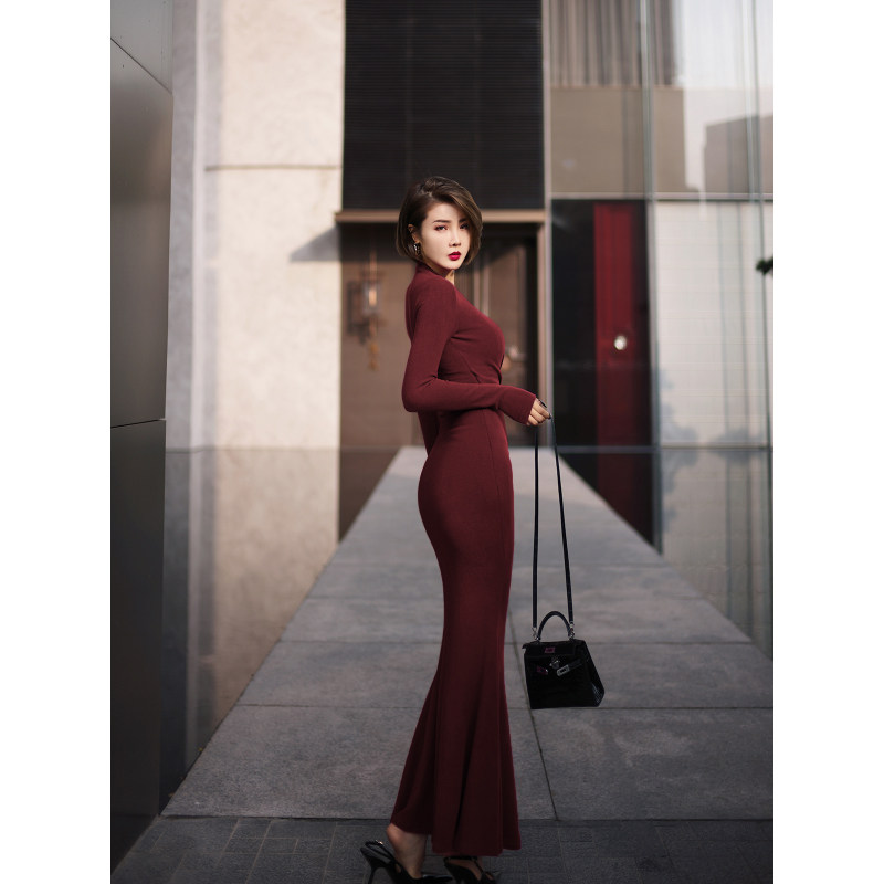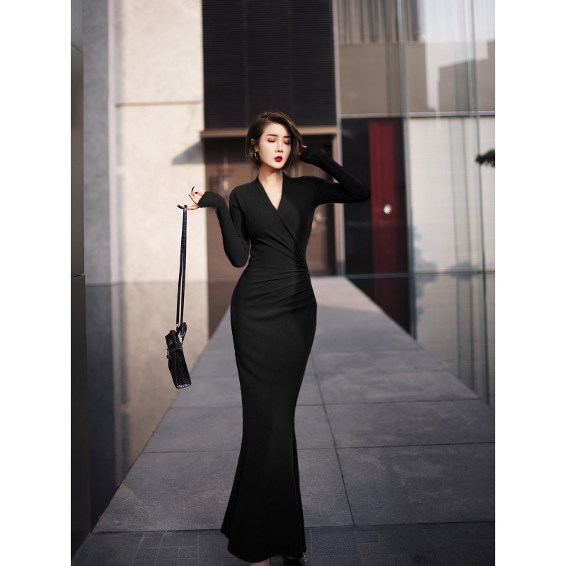 XULU原创气质纯色美利诺慕斯绒优雅鱼尾裙性感高腰包臀V领连衣裙
