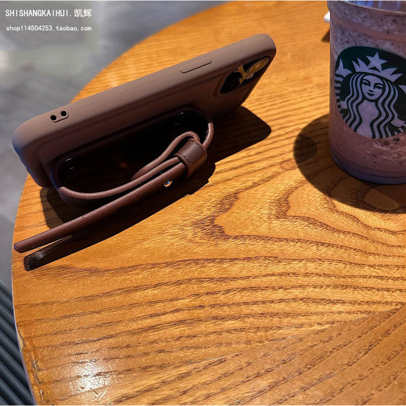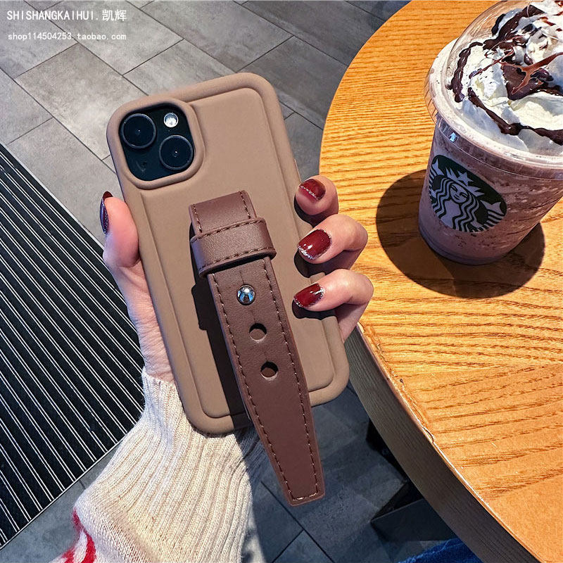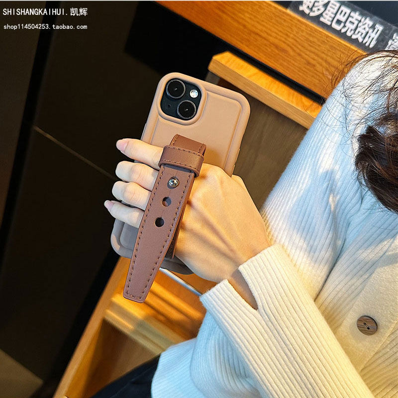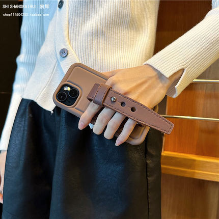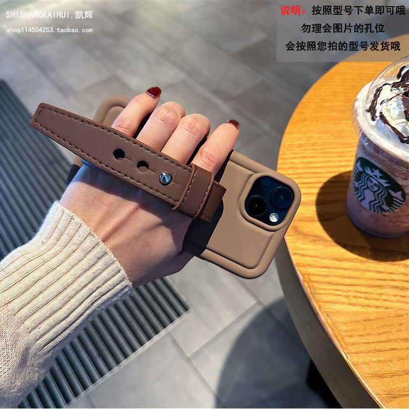 奶茶色真皮腕带适用iphone14手机壳苹果13promax气囊防摔12保护套11pro牛皮层调节皮带xs/xr女新款6s/7/8plus