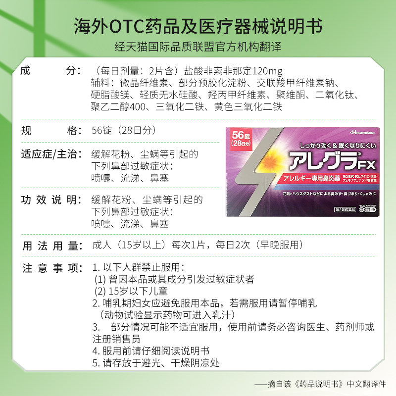 日本进口久光制药FX鼻炎片56粒花粉过敏流鼻涕打喷嚏过敏性鼻炎药