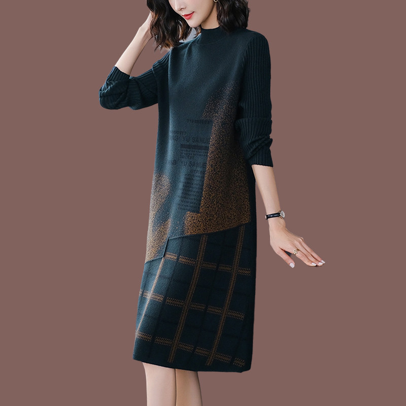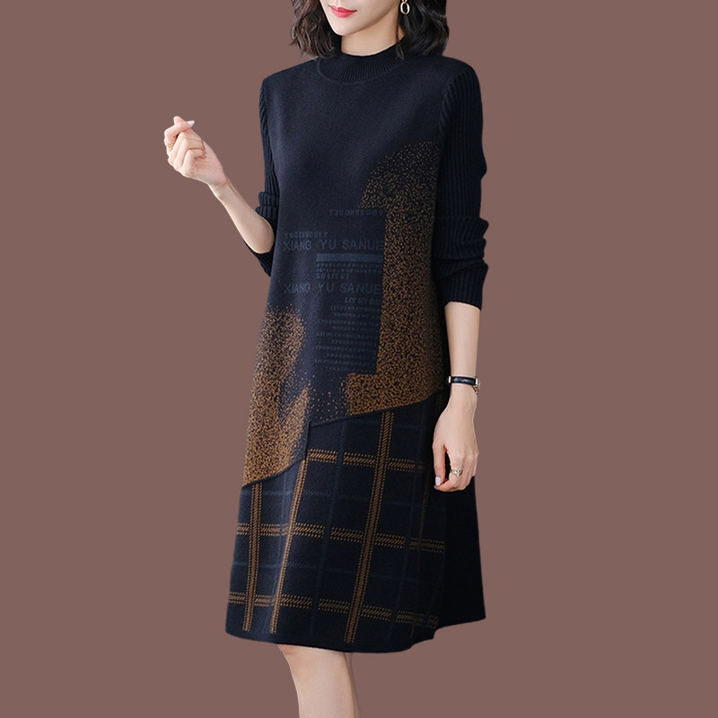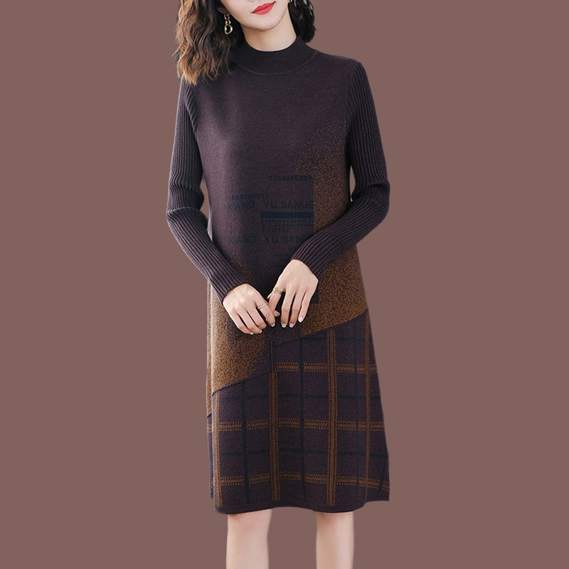 2025年秋冬新款羊绒针织连衣裙女中长款格子妈妈配大衣打底毛衣裙