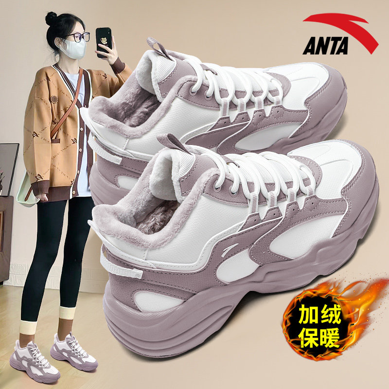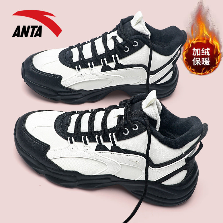 安踏棉鞋女鞋冬季新款高帮加绒保暖户外皮面防水黑白休闲运动鞋子
