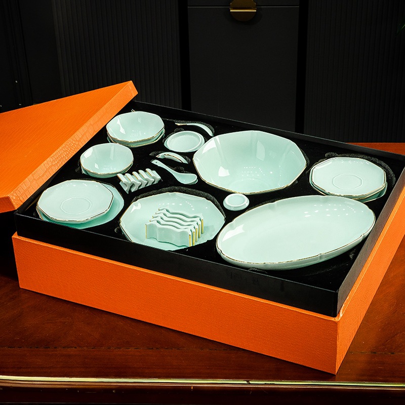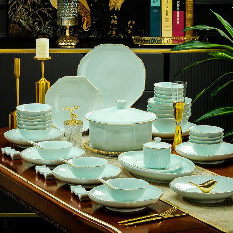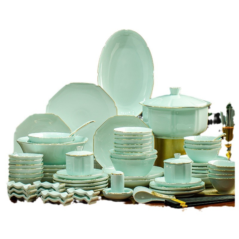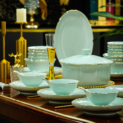 景德镇陶瓷餐具釉下彩新款中式青瓷乔迁送礼碗碟套装家用高级碗盘